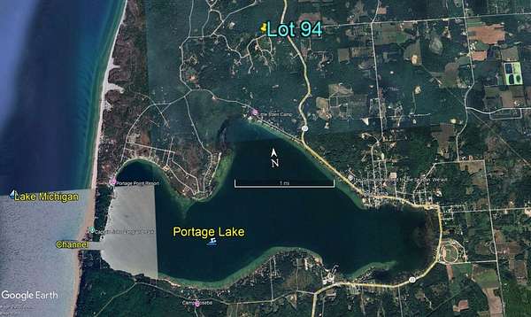 Great views of Lake Michigan and Portage Lake. to watch the sunset on this 1 acre lot. No building height restriction and outbuilding allowed up to 1200 sq. feet. Annual HOA dues are $436. A well has already been drilled. Underground natural gas, electric, and cable to the site. Community pool. A couple of miles to Lake Michigan sandy beaches as well as the connecting Portage Lake. You can possibly rent or purchase slip space at. the Portage Point Inn and Marina. Several golf courses in the area including Arcadia Bluffs, just 7 miles away. Little River Casino is 10 miles. Crystal Mountain Ski & Golf Resort is under 30 minutes away. Visit the developments website to review the master deed and by-laws.