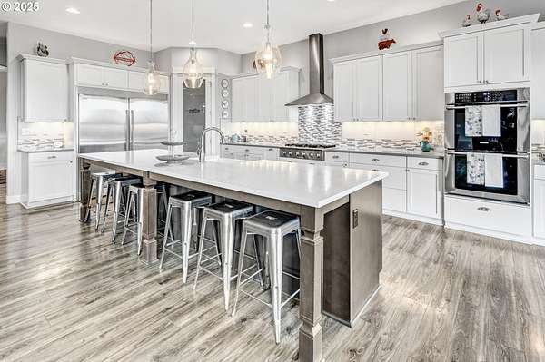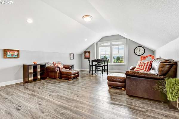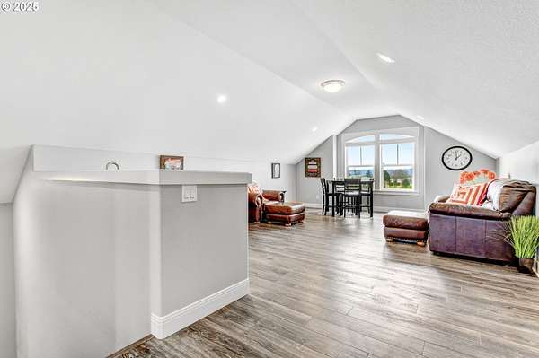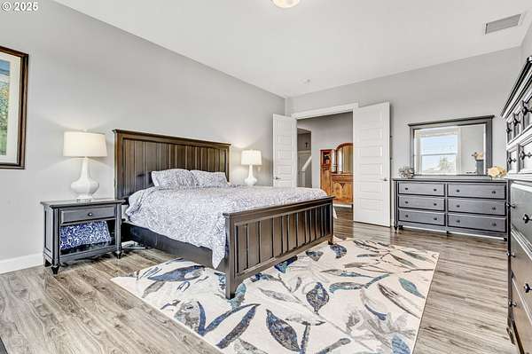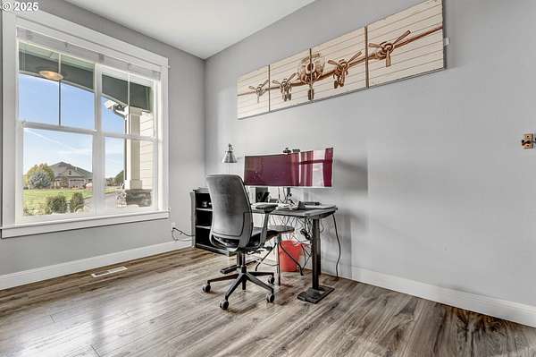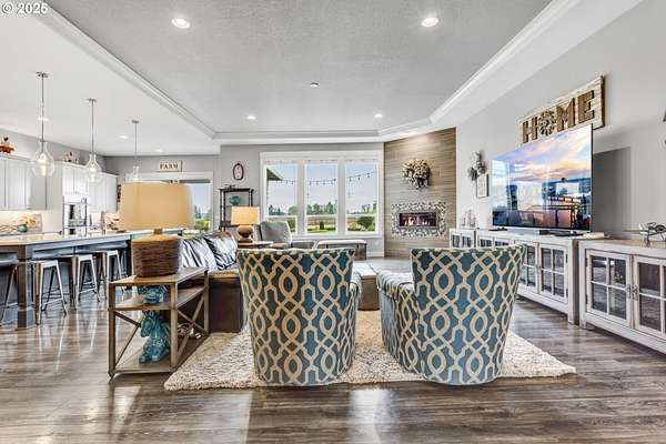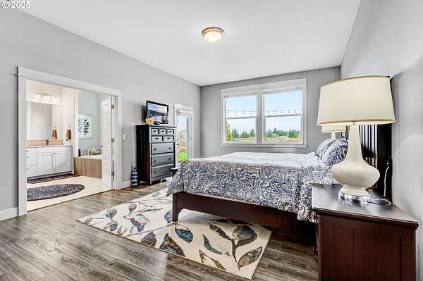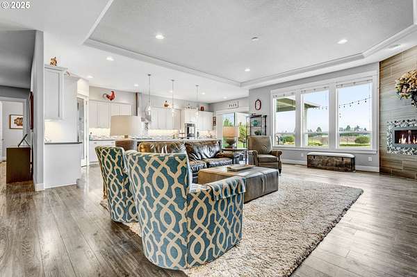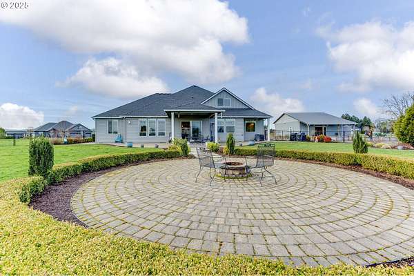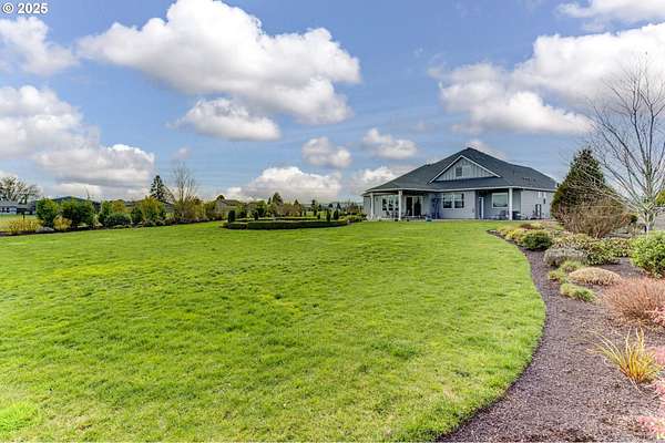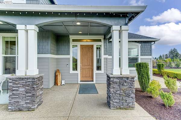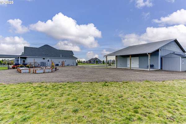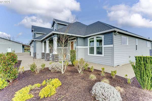 Falcons Landing a community of large lots, outbuildings and planes! Take flight from a private airstrip surrounded by beautiful custom homes and view of mount hood. Master suite on the main floor . Acreage lot on position A and vies front to back as well as positioned for privacy. 4 bedrooms, office , 4 bathrooms, 3 car garage, dog wash, covered patio, and much more! Oversized island in Chef's kitchen perfect for entertaining. Lots of exterior hardscaping. Garden, RV parking, Boat parking, and an out building that will not disappoint. Outdoor fire pit , fenced partially, high end appliances, 95 efficient HVAC, zonal heating, water softener, 2nd story bonus with mini suite. You do not have to be a pilot to appreciate this modern craftsman home.