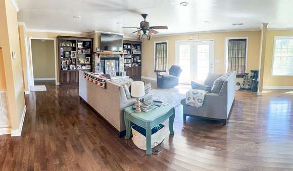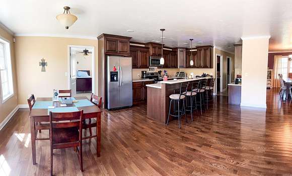 Beautiful custom-built home on 60 acres on Hwy 90 north of Rector. 56 acres m/l woods with hunting possibilities. 4 acres m/l for dwelling and storage buildings. Five [5] bedrooms and four [4] baths and 1/2 bath. Ground floor is 2587 m/l and full finished basement at 2587 m/l. Large primary bedroom suite on ground floor with bath with shower and tub and large walk in closet and sitting area. Two bedrooms with shared bath on opposite end of ground floor. Formal dining room off front entry. Large family room with wood burning fireplace. Large deck off back side of dwelling with stairs to lower level patio. Kitchen has plenty of cabinets with eating bar and dinner table area. Utility room and 1/2 bath at entrance from 2 car garage. Lower level has bedroom, full bath, and two recreational areas. Hunting gear room could also be an additional bedroom. Complete concrete storm shelter/safe room. Patio is under the top level deck. A 20 X 30 dog pen is behind the house. Property has 2 storage buildings for boats, maintenance equipment and storage.