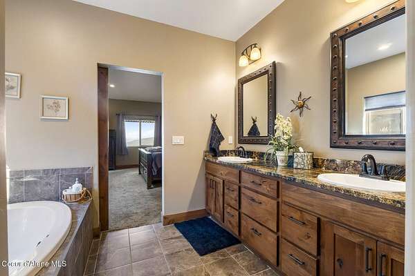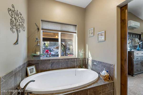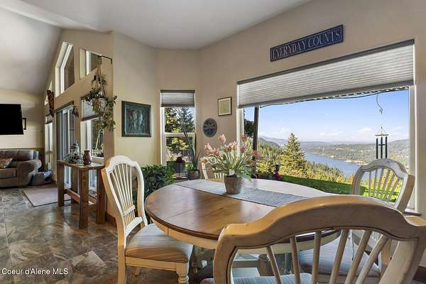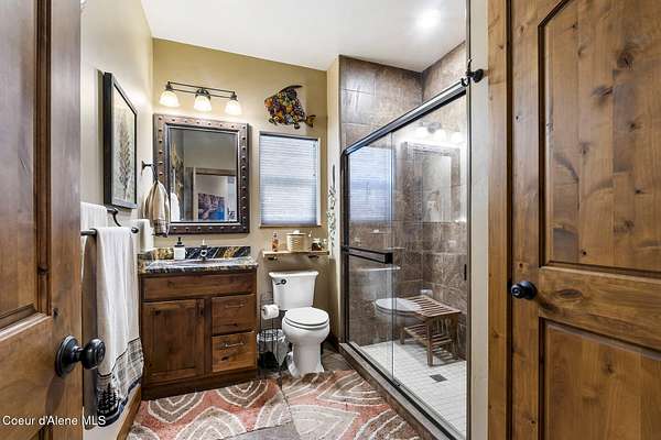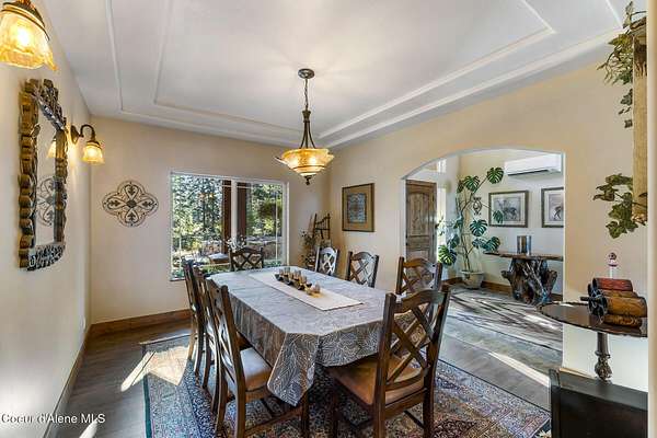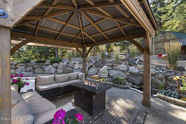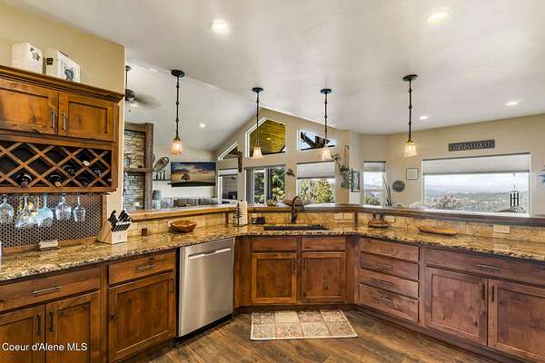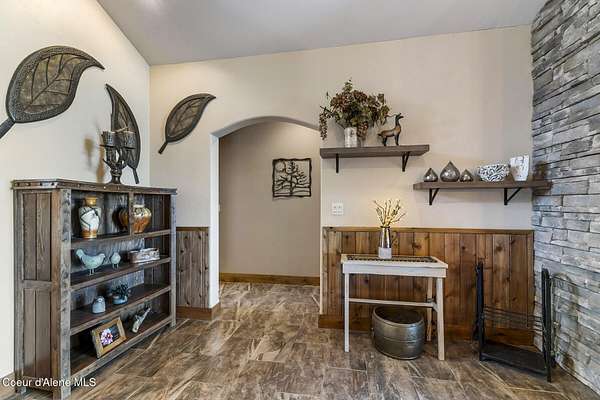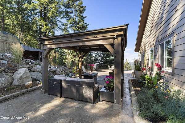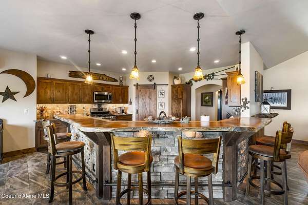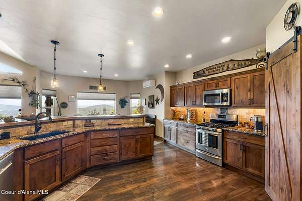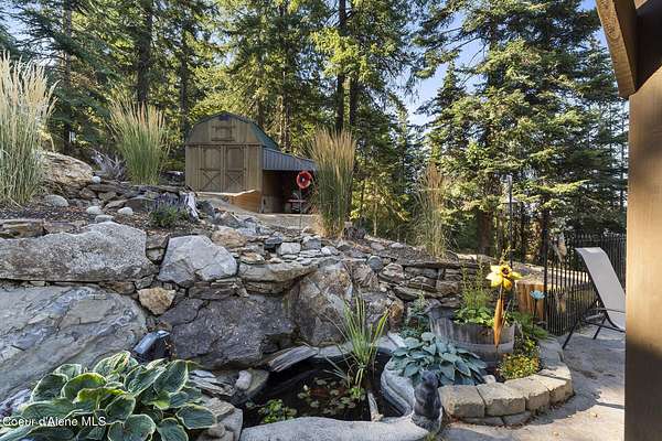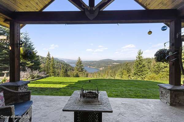 Welcome to this truly unique,One-of-a-Kind Custom-Built retreat nestled in a peaceful, Park-Like setting just 15 minutes from downtown Coeur d'Alene, Idaho. Perfectly located near all amenities yet offering serene privacy, this home is a rare blend or nature, craftsmanship, and convenience. Step inside to experience rich textures and luxurious finishes throughout. The home features hand-troweled Santa Fe textured walls and ceilings, Knotty Alder cabinetry, trim, and solid doors, all adding warm, rustic charm. A striking Walnut live-edge bar anchors the living space adding character and timeless appeal.Designed for comfort and efficiency with radiant heated floors, a 5-zone Mitsubishi mini split system for custom heating and cooling,Supplemental heat with cozy wood burning fireplace. Built in dog shower. Enjoy professional designed hardscape, stamped concrete and slate patios while watching the sunset, the grounds are functional as well as a wheelchair accessible beautiful gem.
