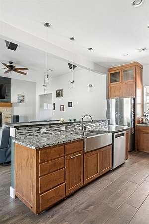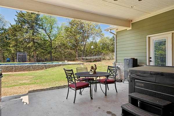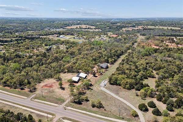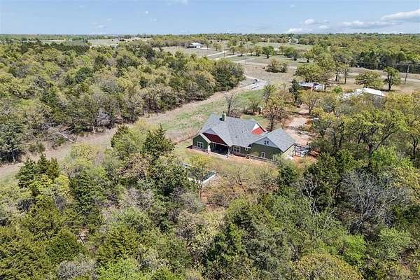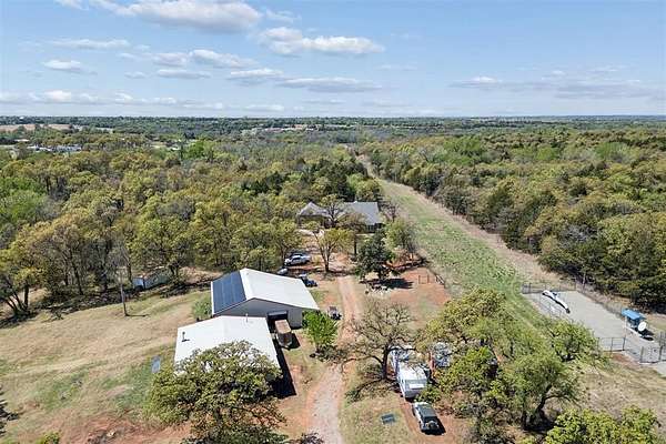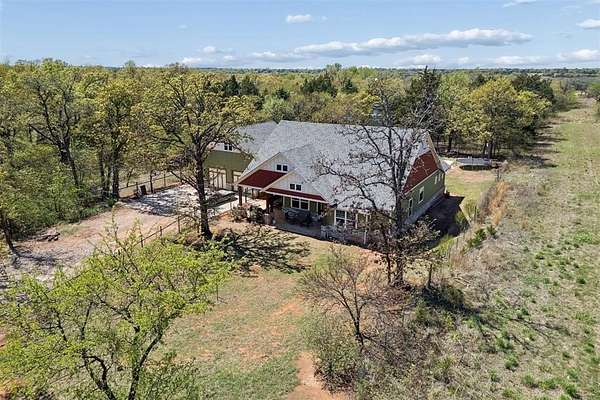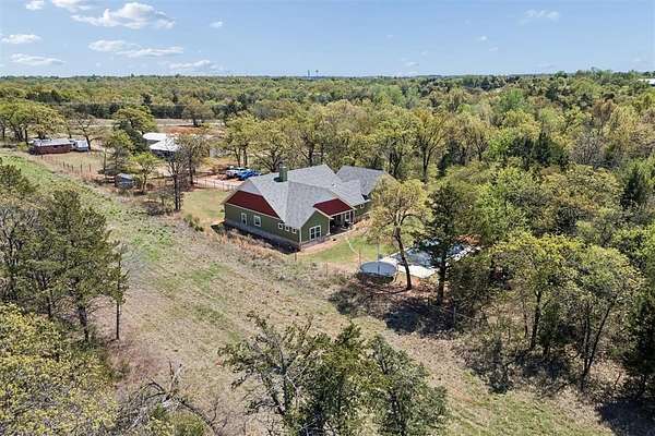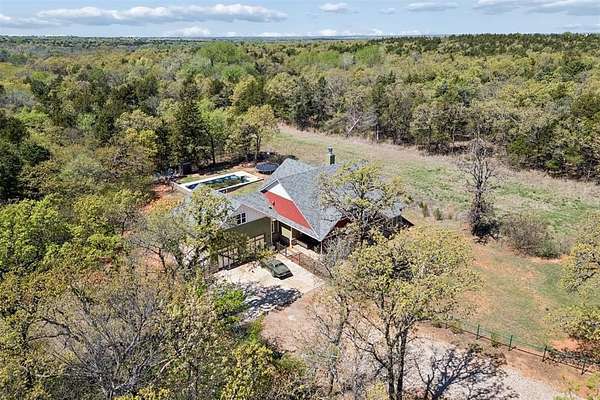 Welcome to 9951 S Coltrane Rd, Guthrie, OK 73044, a rare custom home on acreage offering privacy, flexibility, and upscale country living just minutes from Edmond, Guthrie, and the OKC metro. Tucked into a wooded setting with long-range views, this Guthrie acreage property delivers the features buyers are searching for in a home on acreage near Edmond. Inside, you'll find tall ceilings, a spacious living area, wood-burning fireplace with gas starter, and an open layout built for everyday living and entertaining. The kitchen features granite countertops, custom wood cabinetry, stainless steel appliances, farmhouse sink, gas stove and oven, pot filler, pantry, and bar seating. The floor plan includes 3 bedrooms, an office, and an upstairs game room. The private primary suite offers two closets, double vanities, jetted tub, and separate shower. Wired TV/speaker, CAT5, cable, and security setup add convenience. Outdoor amenities include a covered patio with gas connections, hot tub, TV/speaker wiring, and a 32' x 16' semi-inground pool with newer vinyl liner. Additional highlights include an oversized 2.5-car garage with 220 plug and storm shelter access, automatic whole-house generator, propane, aerobic septic, water filter, and water softener. The property also includes a 40' x 60' shop with lean-to and electric, a second approximately 30' x 40' building with patio, water, separate meter, and separate septic, plus RV hookups behind the shop. Solar panels on the back of the shop are approximately 6 months old. If you're searching for a Guthrie home with acreage, shop, pool, hot tub, second building, and room to live, work, and play near Edmond, this one deserves a serious look.
