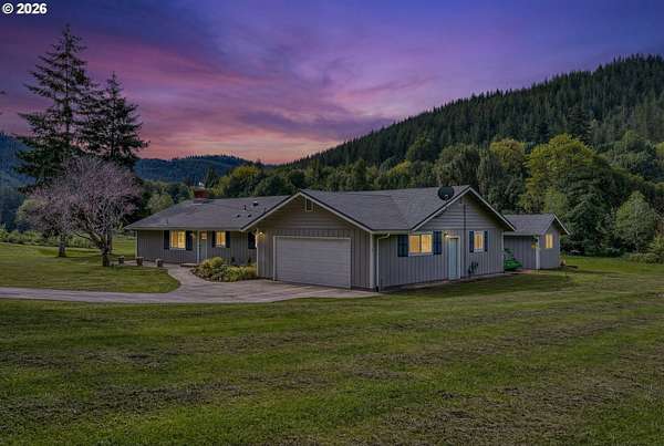 Set on 10.43 picturesque acres, this immaculately updated 3-bedroom, 3-bathroom home offers 1,904 sq. ft. of thoughtfully designed living space, blending modern comfort with the beauty of the outdoors. From the moment you step inside, you're welcomed by a light-filled open-concept layout that creates a seamless flow between the living, dining, and kitchen areas-perfect for both everyday living and entertaining. The home features two spacious primary suites, each with its own private bathroom, offering rare flexibility for multi-generational living, guests, or added privacy. An attached garage adds convenience, while quality updates throughout ensure a truly move-in-ready experience. Step outside onto the back deck and take in peaceful views of your expansive property, complete with Middle Creek frontage-a serene, natural backdrop that makes every day feel like a retreat. Whether you're enjoying your morning coffee, watching wildlife, or planning your next outdoor project, this property invites you to slow down and stay awhile. With over 10 acres of usable land, the possibilities are endless-create your dream hobby farm, bring animals, or simply enjoy the space and privacy. Rarely does a property offer this combination of updated living, beautiful acreage, and inspiring potential-come see it for yourself and imagine the lifestyle waiting here.