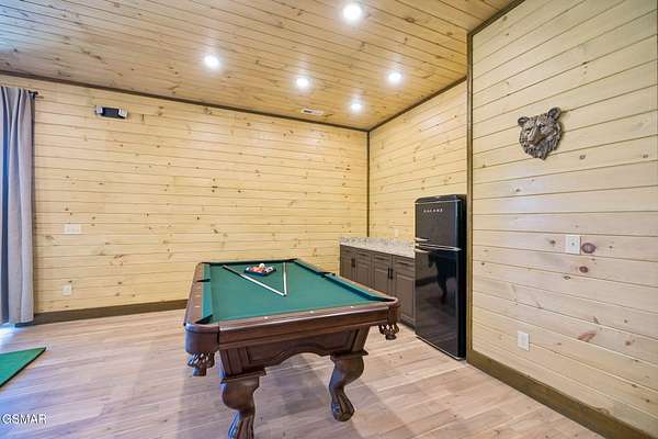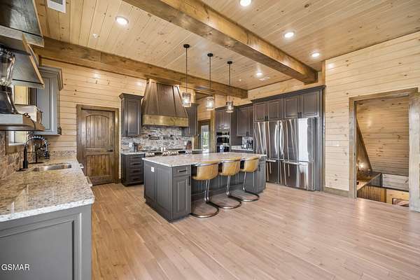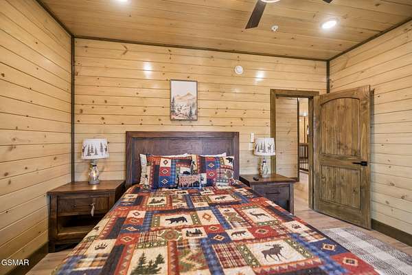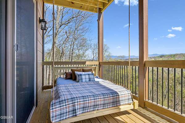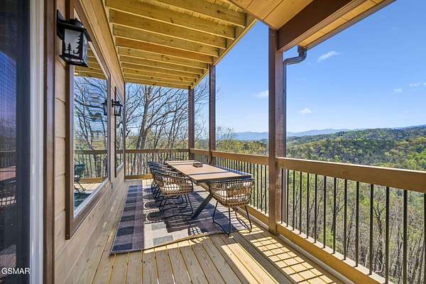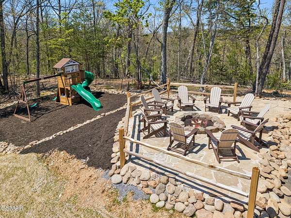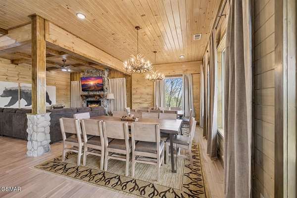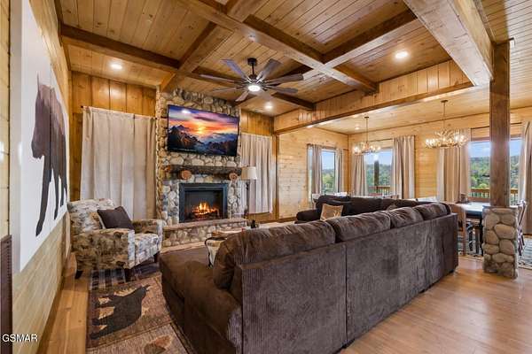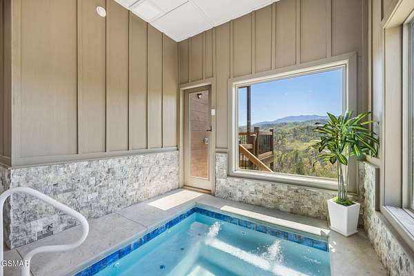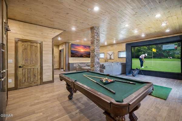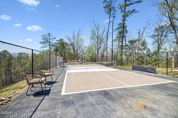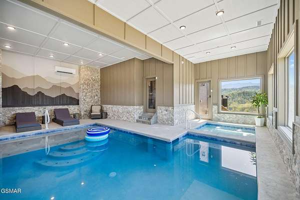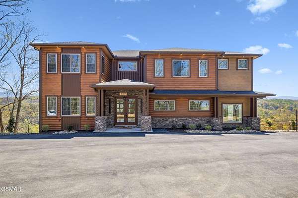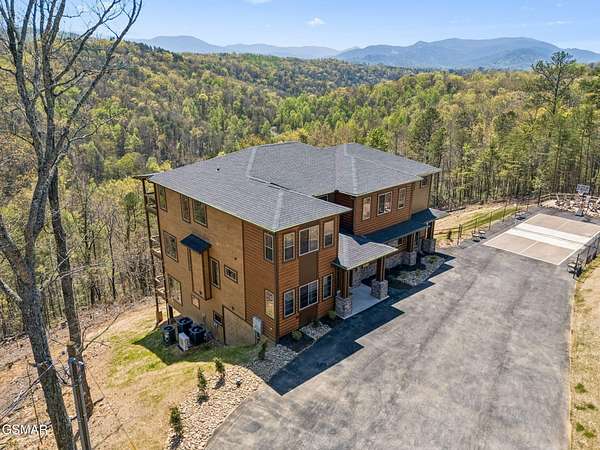 Ever wanted your own private mountain top? Well here it is! This extraordinary mountain retreat is a rare blend of grand scale, thoughtful design, and resort-style amenities. Offering six spacious bedrooms plus bonus rooms throughout, this massive cabin was built to impress and designed for both comfort and entertainment. The heart of the home is a chef's kitchen featuring stainless steel appliances, two of every major appliance, dual stoves topped with a custom range hood, plus a third stove with a built-in microwave--perfect for hosting large gatherings with ease. The open living area is anchored by a stunning river rock fireplace, creating a warm and inviting mountain atmosphere. Entertainment options abound, including a large game room wired for a golf simulator projector, surrounded by beautifully lighted custom cabinetry. Custom accent walls are showcased throughout the home, adding character and craftsmanship at every turn. Each level features luxurious tile showers, while the expansive primary suite boasts a massive tiled walk-in shower with a soaking tub built directly inside. A charming hidden reading cabin tucked beneath the stairs offers a magical retreat just for kids. Step outside to enjoy your private pickleball court--fully fenced and easily converted into a basketball court. Inside, the amenities continue with a spectacular indoor pool and spa, framed by stone walls and concrete stamped floors for a true lodge-style experience. The exterior is just as impressive, with stone and log siding that complement the natural surroundings. Take in breathtaking Smoky Mountain views from both private and shared decks, making every sunrise and sunset unforgettable. This one-of-a-kind cabin delivers luxury, space, and recreation in an unparalleled mountain setting--an ideal primary residence, vacation home, or income-producing investment. Drone photography used.