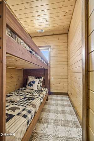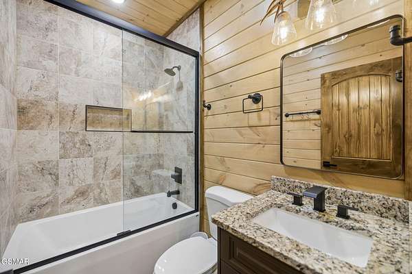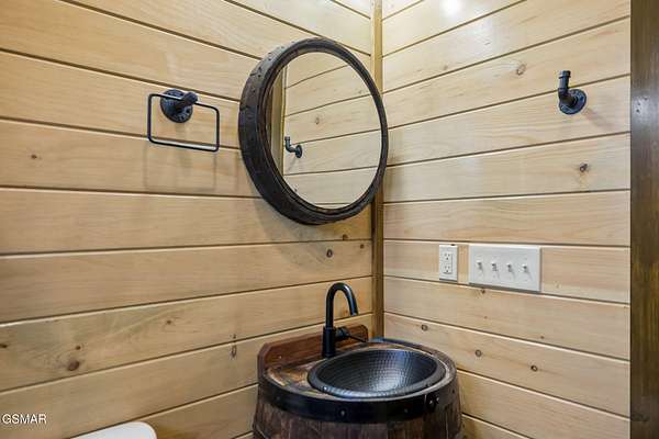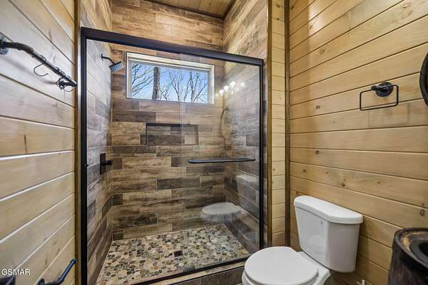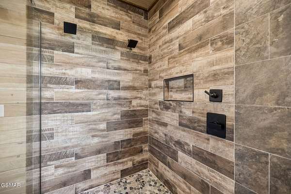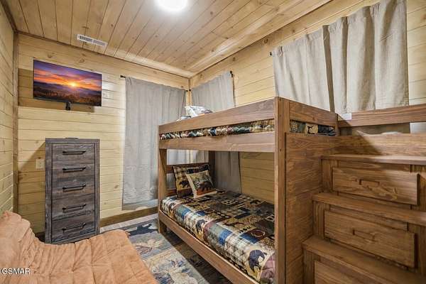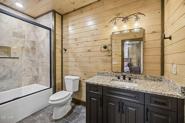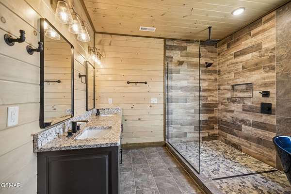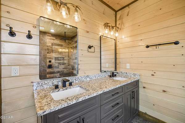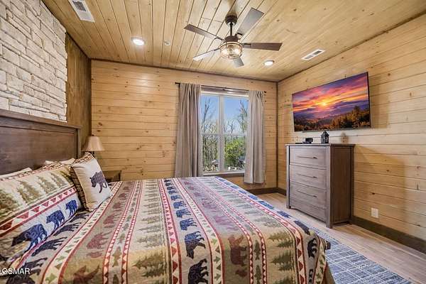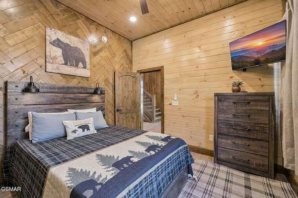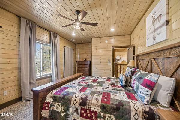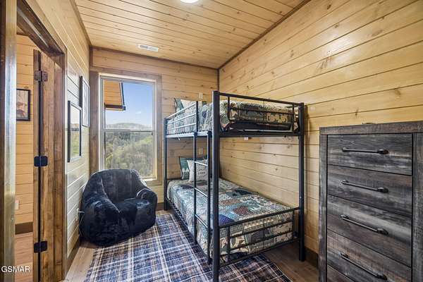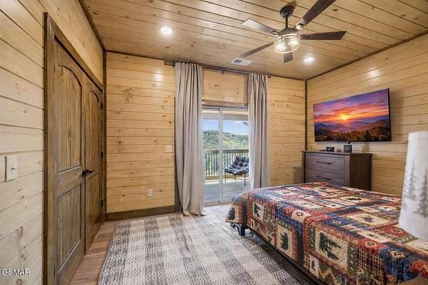 Ever wanted your own private mountain top? Well here it is! This extraordinary mountain retreat is a rare blend of grand scale, thoughtful design, and resort-style amenities. Offering six spacious bedrooms plus bonus rooms throughout, this massive cabin was built to impress and designed for both comfort and entertainment. The heart of the home is a chef's kitchen featuring stainless steel appliances, two of every major appliance, dual stoves topped with a custom range hood, plus a third stove with a built-in microwave--perfect for hosting large gatherings with ease. The open living area is anchored by a stunning river rock fireplace, creating a warm and inviting mountain atmosphere. Entertainment options abound, including a large game room wired for a golf simulator projector, surrounded by beautifully lighted custom cabinetry. Custom accent walls are showcased throughout the home, adding character and craftsmanship at every turn. Each level features luxurious tile showers, while the expansive primary suite boasts a massive tiled walk-in shower with a soaking tub built directly inside. A charming hidden reading cabin tucked beneath the stairs offers a magical retreat just for kids. Step outside to enjoy your private pickleball court--fully fenced and easily converted into a basketball court. Inside, the amenities continue with a spectacular indoor pool and spa, framed by stone walls and concrete stamped floors for a true lodge-style experience. The exterior is just as impressive, with stone and log siding that complement the natural surroundings. Take in breathtaking Smoky Mountain views from both private and shared decks, making every sunrise and sunset unforgettable. This one-of-a-kind cabin delivers luxury, space, and recreation in an unparalleled mountain setting--an ideal primary residence, vacation home, or income-producing investment. Drone photography used.