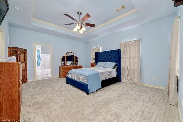 The master suite boasts tray ceilings, new carpet, two walk-in closets, and a roomy ensuite bath. The addtitional bedrooms are generous in size, have new carpet, and the front bedoom has big windows and a gorgeous view.