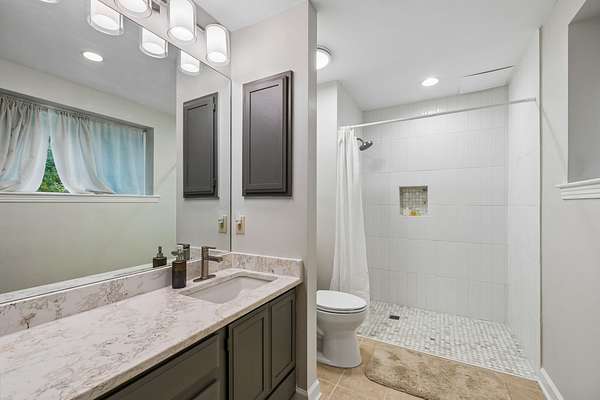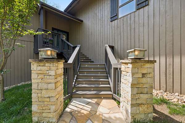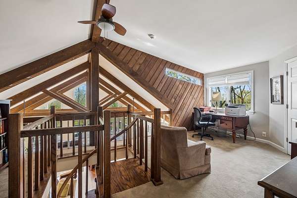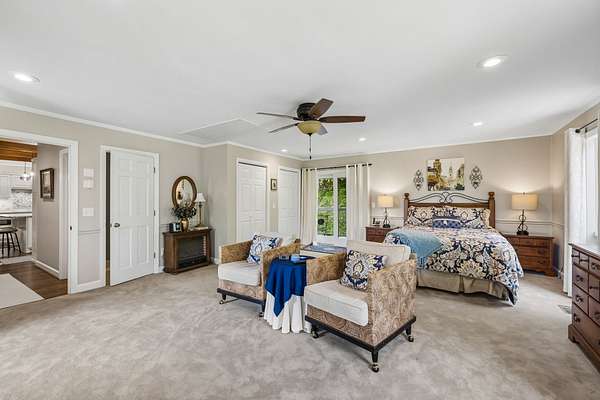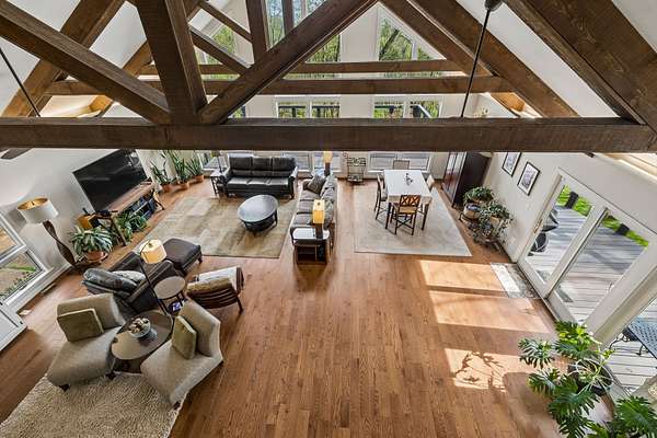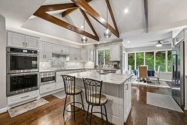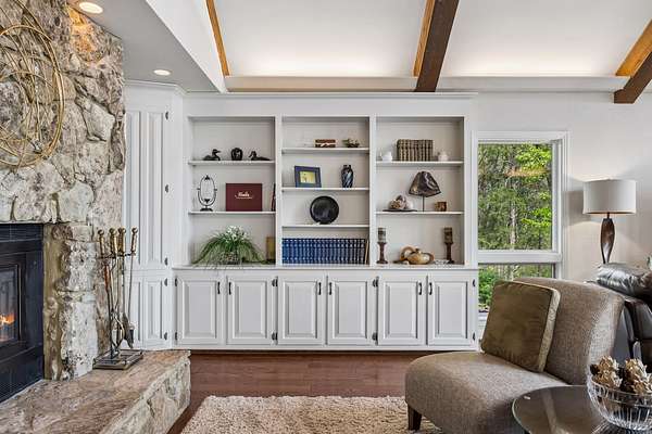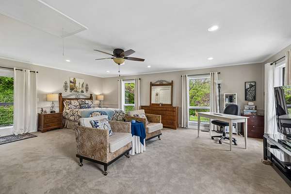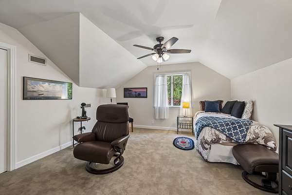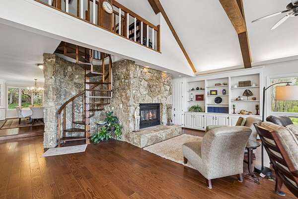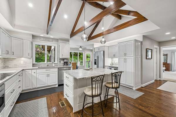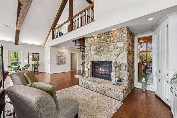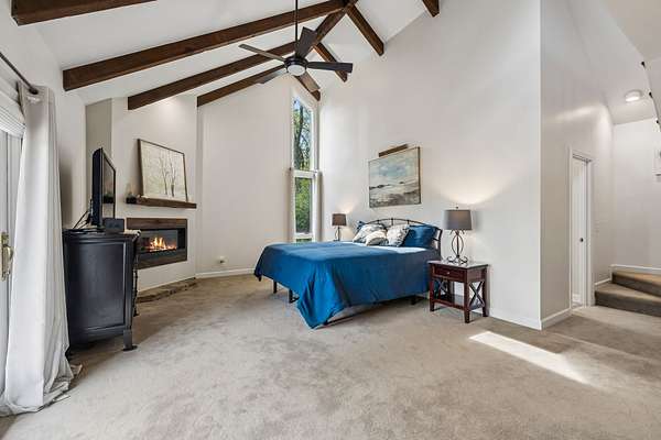The renovated eat-in kitchen features a leathered granite island, while the formal dining room opens to the main living area for easy flow. The home includes two bedrooms on the main level and two additional bedrooms on the lower level. The spacious primary suite features a gas fireplace and loft area.