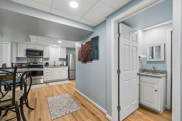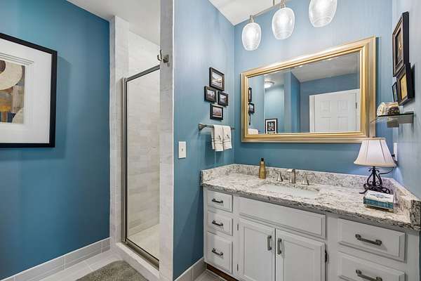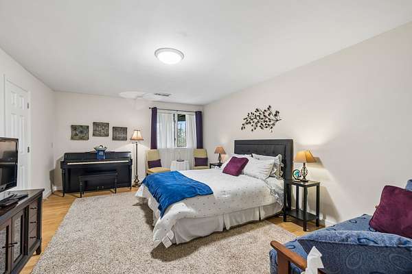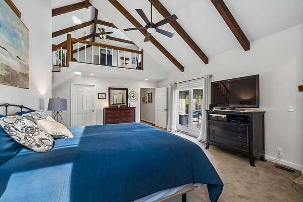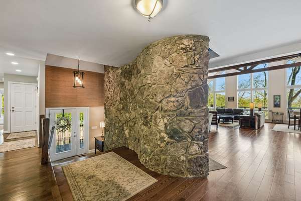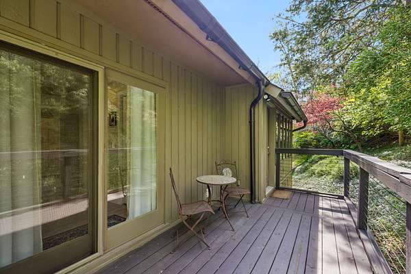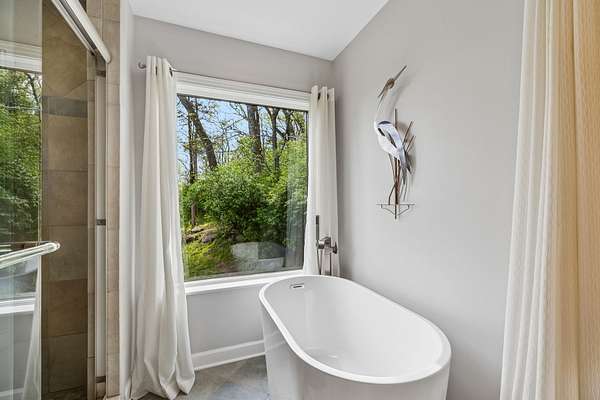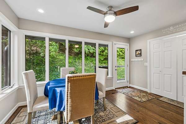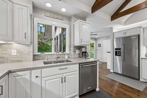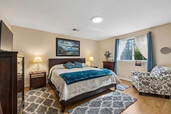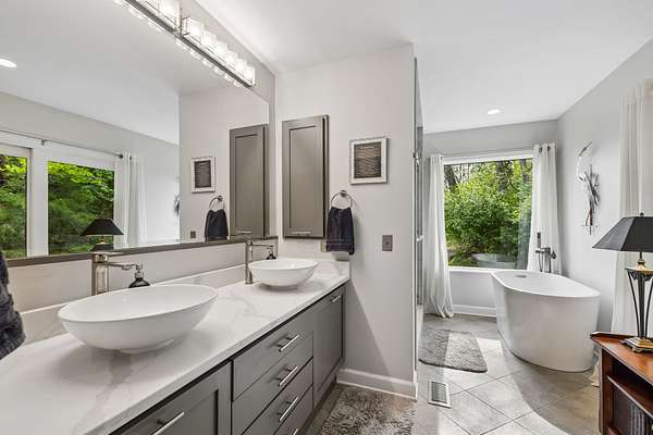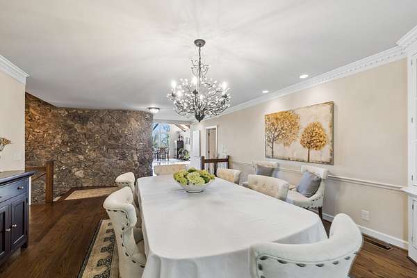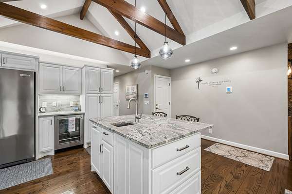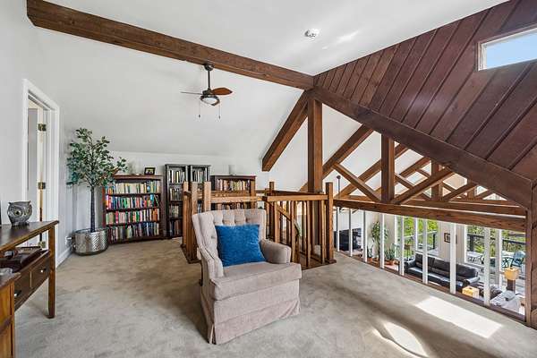 The renovated eat-in kitchen features a leathered granite island, while the formal dining room opens to the main living area for easy flow. The home includes two bedrooms on the main level and two additional bedrooms on the lower level. The spacious primary suite features a gas fireplace and loft area.