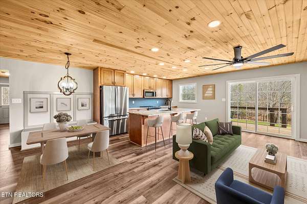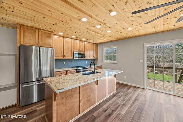 Nestled on 1.77 surveyed acres of picturesque land, this completely remodeled/renovated farmhouse exudes country and contemporary living charm! The exterior features a stunning wrap around porch gracing three sides of the house, front is covered, making it perfect for enjoying your morning coffee. The new metal roofing will be perfect for those rainy days! Off the backyard is a small bluff leading down to your spring-fed wet weather creek. The possibilities are endless there for creating your own space for observing nature! Step inside to discover an inviting open floor plan that seamlessly connects the living, dining and kitchen areas with Tongue and Groove Pine ceilings throughout. The spacious living room boasts large windows that flood the space with natural light, enhancing the warm, welcoming atmosphere. Beautiful granite countertops adorn the kitchen, providing both functionality and style. Ample custom maple cabinetry and a large island with bar seating offer plenty of space for meal prep and entertaining. The Master Suite featuring a luxurious walk-in tile shower and a spacious layout that ensures privacy and comfort. Just across the Master suite is the large Laundry/Utility room offering convenience and functionality. Two additional bedrooms provide flexibility for family or visitors, each tastefully designed to compliment the home's overall aesthetic. Outside the expansive backyard offers plenty of room for gardening, outdoor activities or simply enjoying the tranquility of nature. The serene setting, combined with the farmhouse's modern amenities creates the perfect balance of country living charm! This property is a dream for those seeking a peaceful rural lifestyle without sacrificing modern comforts. Bringing You Home!
