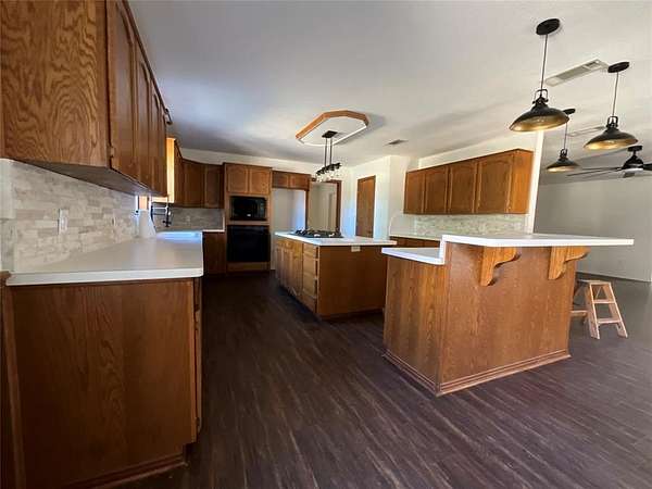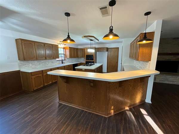 The focal point of the large living room is a beautiful native rock fireplace and complete with a nice wet bar and French doors leading to an outdoor patio. There are 3 additional large bedrooms and guest bath down the hall. A large utility room with bath adjacent to the garage with door leading to patio. The surrounding 34 acres is a good mix of hardwoods and brush providing great habitat for wildlife and native grass providing grazing for livestock. This is a very nice homestead at the edge of Hamilton offering peaceful and private living with freshlye updated interior.
