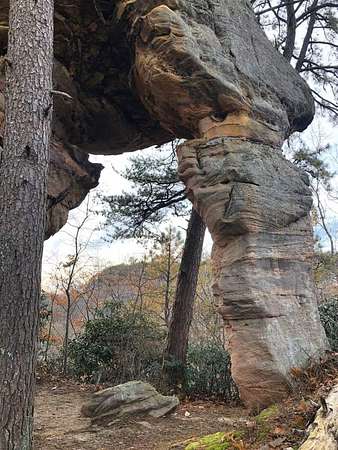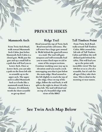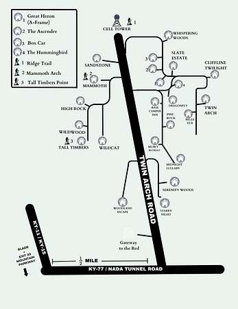 Take the mountain parkway to exit 33. Turn Left and then left again at the end of the road. Go 1.5 miles and take a right on KY 77. Go less than a mile and turn left on Twin Arch Rd. The lot will be across from the pump house.