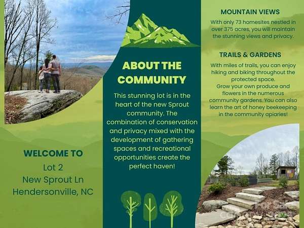 Welcome to Lot 2, in the Sprout community! Sprout is 375 acres of nature with only 73 homesites! The views from Lot 2 are breathtaking and there are some amazing rock outcroppings with many possibilities! Sprout is a gated community that was designed with you in mind! Some of the community features the developer plans and states on their website are miles of walking trails, community gardens where you can grow produce, herbs, and flowers, as well as you can learn how to successfully care for honey bees from the community bee-keeper. All this nestled in the mountains of Western North Carolina, and yet 20 minutes to the airport and all shopping amenities and 30 minutes from Asheville. The seller hired award winning architecture firm, Rusafova Markulis for a site plan, floor plans, and renderings, all of which will be available to the buyer of this wonderful property! Build on top and have these mountain views every day with the ease of a mostly level area at the top of the lot!