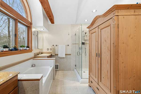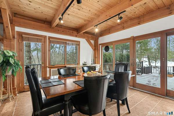 Perched high on 2 private acres, this home is an ideal full-time primary residence or a peaceful weekend retreat. This custom Post & Beam home delivers warmth, character, and timeless craftsmanship. Soaring ceilings, exposed beams, skylights, and walls of glass create a light-filled, open atmosphere. Beautiful imported Indian slate adds rich texture perfectly complementing the home's rustic-modern aesthetic. The main living area flows effortlessly from the kitchen (showcasing granite countertops, stainless steel appliances and a generous center island) into comfortable living and dining spaces designed for gathering and entertaining. An office and family room both with wood burning fireplaces, complete the main floor. The second floor offers three spacious bedrooms, including a private primary suite, and a surprising flex space that could make for additional office, reading, sleeping spaces. Outside an expansive deck overlook a serene flat back yard and mature wooded surroundings, the perfect setting for morning coffee, summer evenings, or quiet weekends away from the city. Newer Washer+Dryer on Bedroom level. Newer Furnace, Hot Water Tank and Water Holding Tank. Lifetime coverage warranty on roof, includes material and labor, transferable to second homeowner round out this home for easy worry free living. Located 1.6 miles from Lake Lillinonah/boat launch, minutes from Candlewood Lake/Brookfield Beach, farmstands, parks, and hiking trails just 1.5 hrs from NYC.
