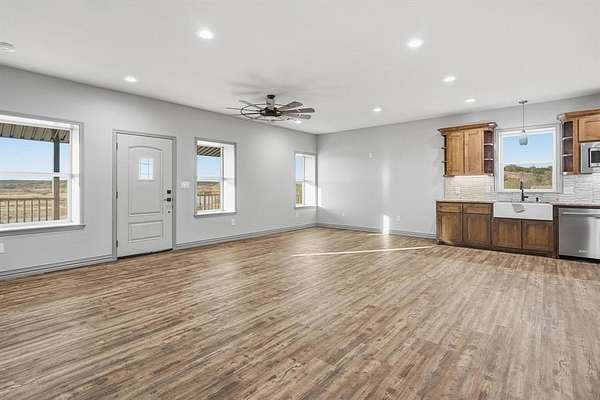 Upon entering, you're greeted by an impressive and beautifully designed living space adorned with high ceilings and expansive windows that capture breathtaking 360-degree views of the surrounding West Texas Hills. The open-concept design seamlessly integrates the living, dining, and kitchen areas, creating an inviting space for both intimate family gatherings and grand entertaining.