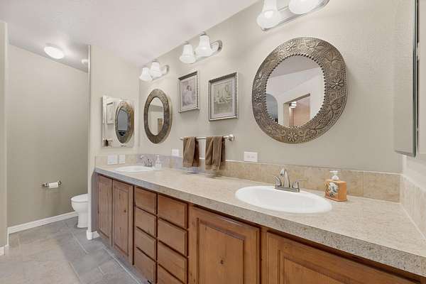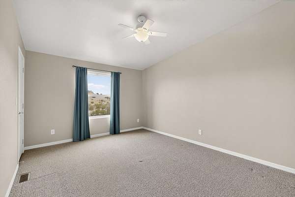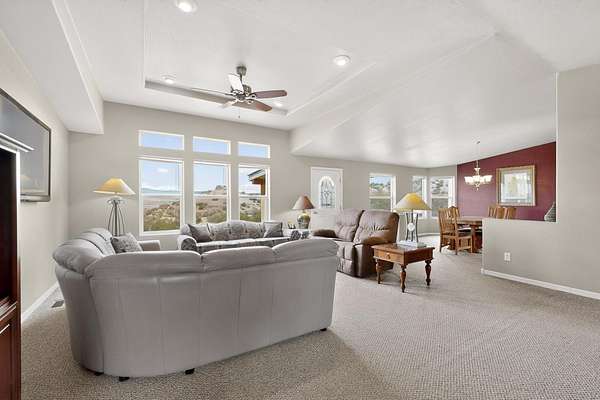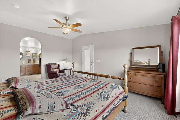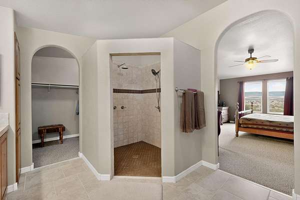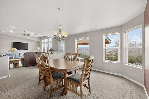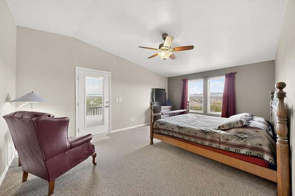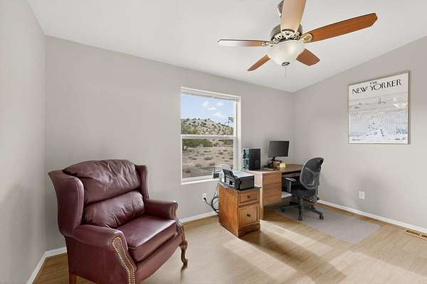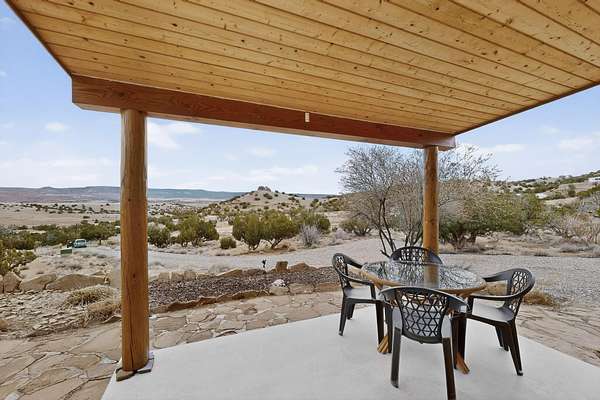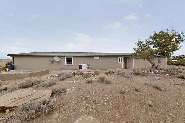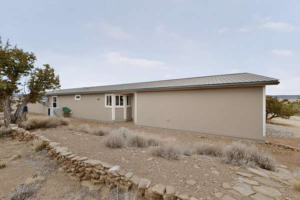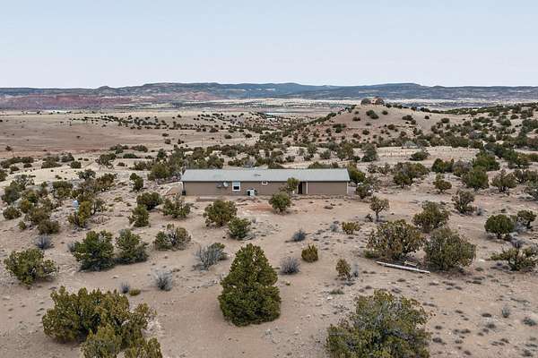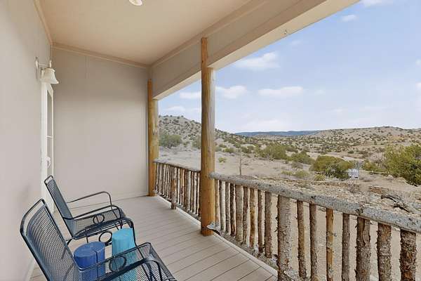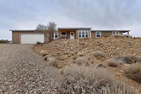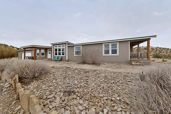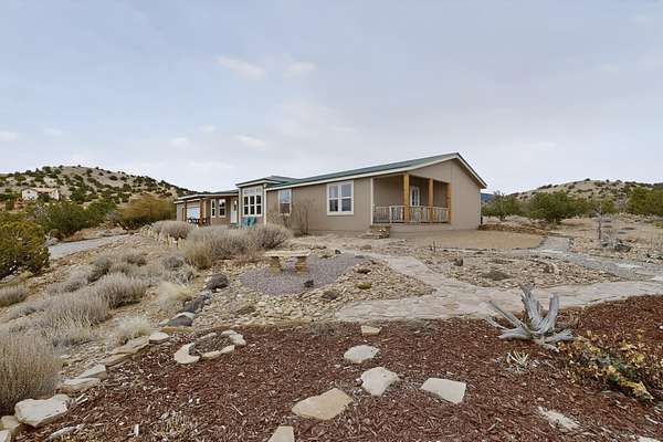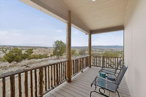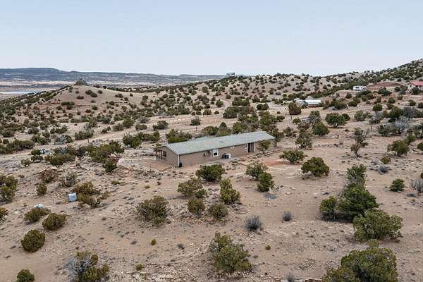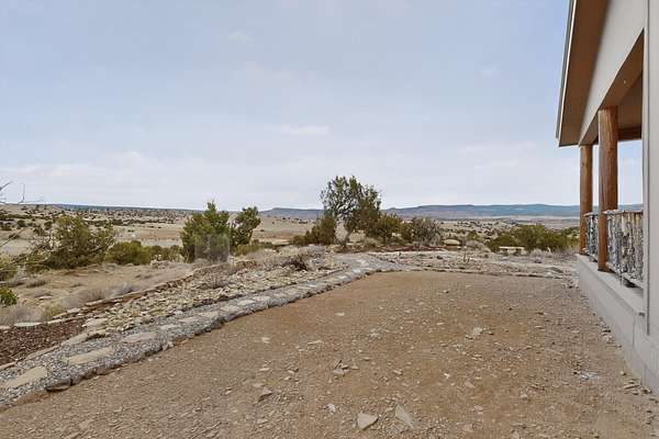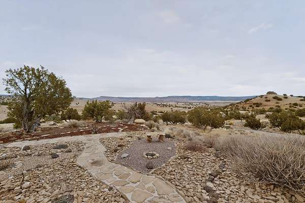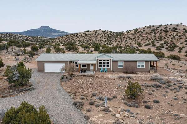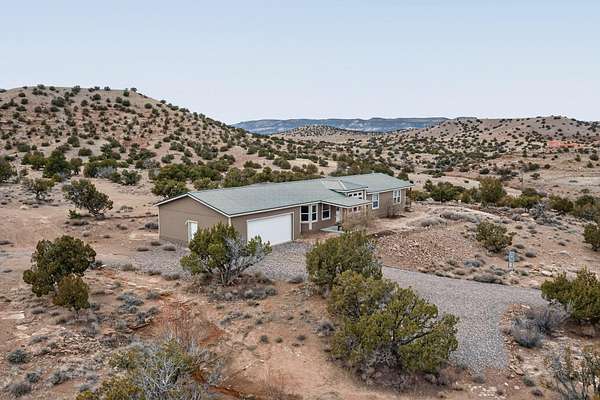 Discover unparalleled tranquility and magnificent scenery at this exceptional 9.43-acre property, offering quiet privacy and stunning lake and mountain vistas. This meticulously maintained acreage is fully fenced, providing a secure and serene environment for the perfect New Mexico lifestyle. The full-featured, spacious 2,010 sq. ft. home is designed for comfortable living and practical functionality. Storage is ample, including an oversized laundry room and an impressive 30 ft. by 30 ft. garage. The heart of the home is the spacious, user-friendly kitchen, a culinary delight boasting high-quality finishes, a Bosch dishwasher, and a central island complete with a second sink and a convenient eating bar.The master suite is a true sanctuary, featuring its own private covered porch-an ideal spot for morning coffee or quiet reflection. The large ensuite bath is a luxurious space with a beautifully tiled walk-in shower and an expansive, huge closet. The second bedroom offers the same stunning views as the master and includes its own generous walk-in closet. A flexible office space features elegant built-in cabinetry and holds the potential to easily serve as a comfortable third bedroom. Throughout the home, you will find high-end architectural details and finishes, including soaring vaulted ceilings, solid stem walls, rich hickory cabinets, graceful arched doorways, and durable berber carpets. Allow yourself to be completely enchanted by the legendary sunrises and sunsets that grace this part of New Mexico, painting the sky with unforgettable colors. We invite you to experience this property in full detail. Read the narrative under the first two photos. Please watch the comprehensive 3D VIDEO and the SHOWCASE VIDEO to fully appreciate the unique beauty and quality of this extraordinary lake-view retreat.