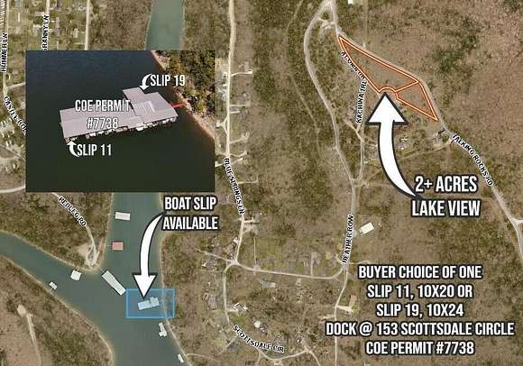 LAKE VIEW LOT, 2+ ACRES, BOAT SLIP AVAILABLE, COMMUNITY WATER, NEAR BRANSON WEST. Now is the time to buy to make sure you have a place to build your future lake home. Start enjoying Table Rock Lake now with the purchase of a nearby boat slip being offered by the owner of the lot for an additional $50,000. You will have your choice of one of two boat slips in the dock on the shoreline below 153 Scottsdale Circle, Branson West. Slip #11 a 10 x 20 or slip #19 a 10 x24 and this dock features a nice swim deck. Connection to subdivision community water well is available and 1200 minimum square feet on ground floor. Zoned R-1 for single-family residential use. Conveniently located near Branson West. Check this one out. Seller prefers Great American Title, Branson West for title and closing.