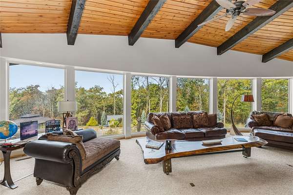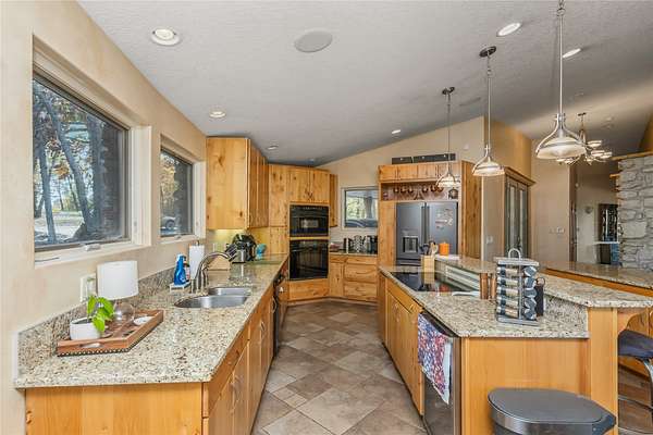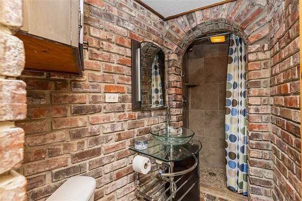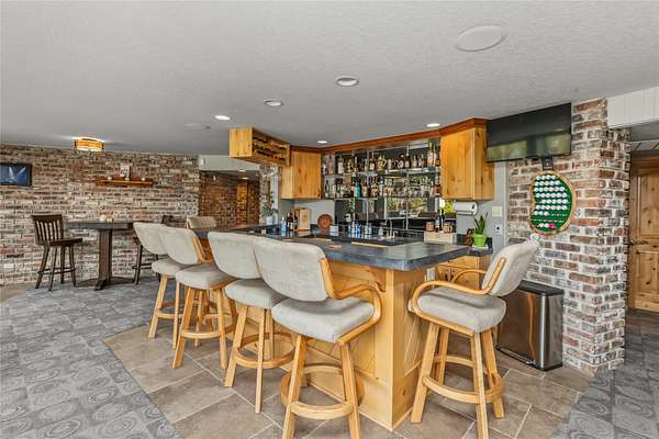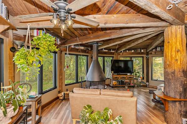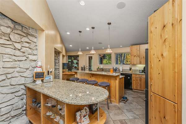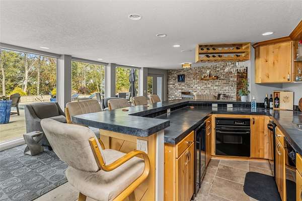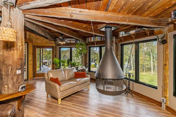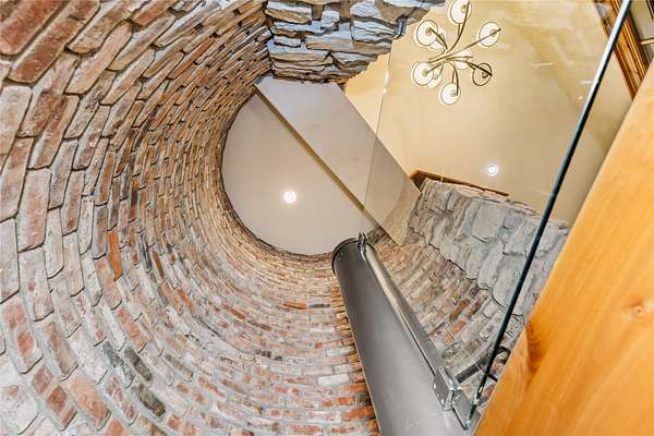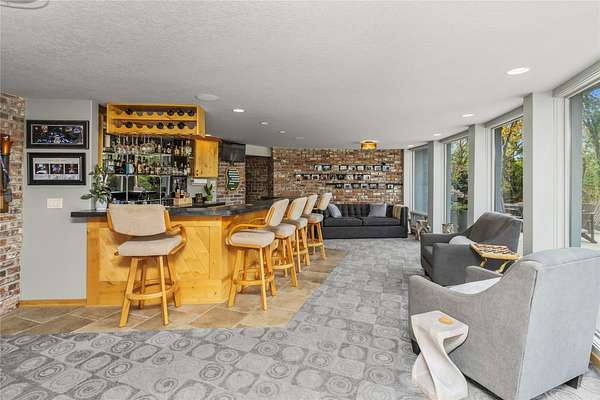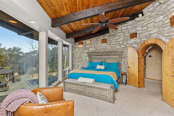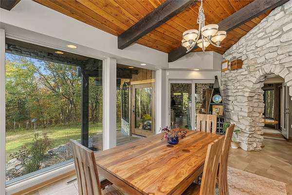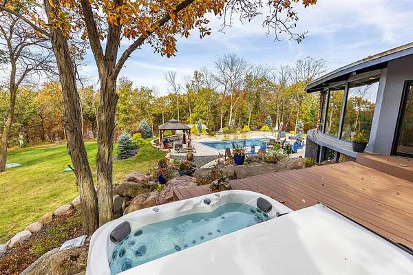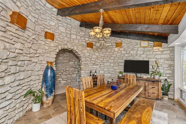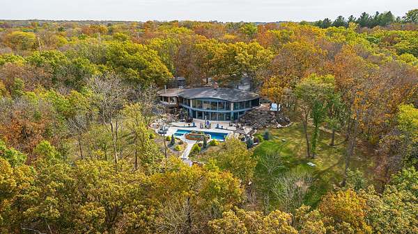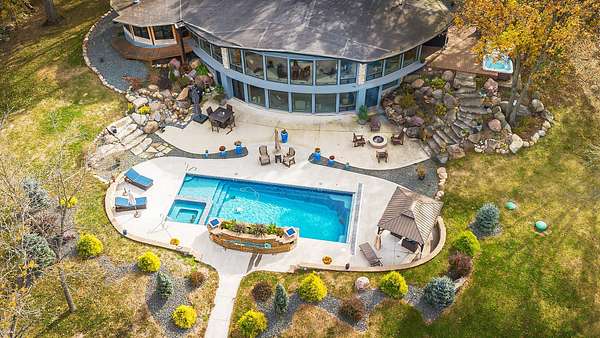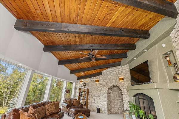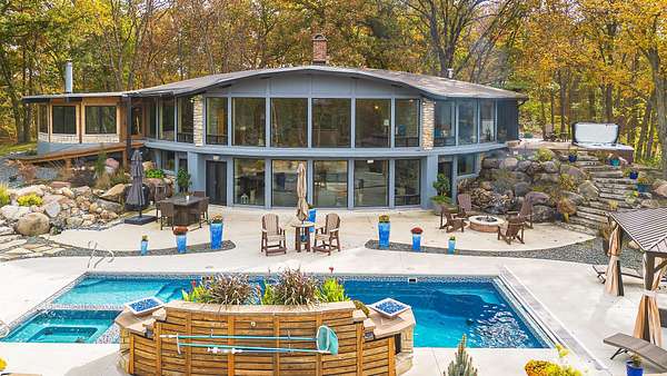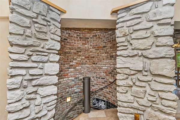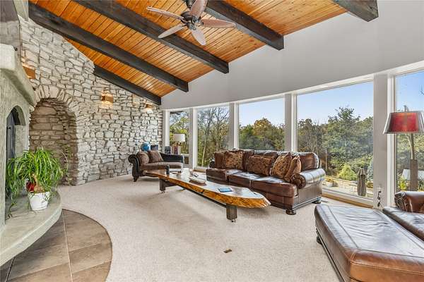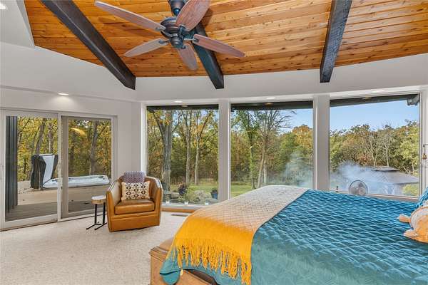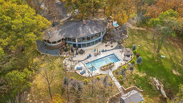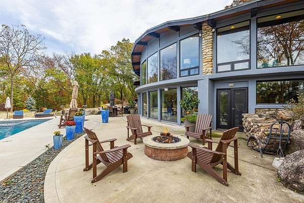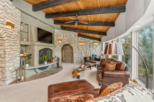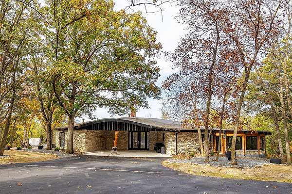 Executive retreat on nearly 4-acres of wooded land just a quick jump from the metro. This architectural marvel has a mid-century design with locally sourced woods and limestone. In addition, you will find custom alder cabinetry, unique brickwork, and amazing stone archways. You will find floor-to-ceiling windows across the back of the house overlooking your wooded land and fantastic pool area. Enter the home through double doors where you will find a beautiful, brick spiral staircase, large kitchen, dining room, amazing great room with wood ceiling and custom fireplace; and a sunroom that is surrounded with new Pella windows, unique fireplace, heated tile floor, bookshelves, and a stunning wood ceiling. Also on the main is the private primary suite filled with windows, dressing room, bathroom with both jetted tub and tile shower, and a walk-in closet. Descend to the lower level through the beautiful spiral staircase to a gorgeous wet bar with all the appliances needed to entertain, two additional bedrooms and a full bathroom. Perhaps the most amazing part of this unique property is on the outside. Amazing pool area surrounded by patios, covered pergola, two water features, fire pit, separate deck area with hot tub, and a nearby shed for all your pool equipment and toys. Over 4,300sf of living space, 3 fireplaces, concrete construction, geothermal heating/cooling 'a one-of-a-kind masterpiece in your own private wooded sanctuary.