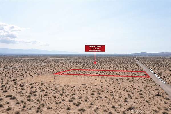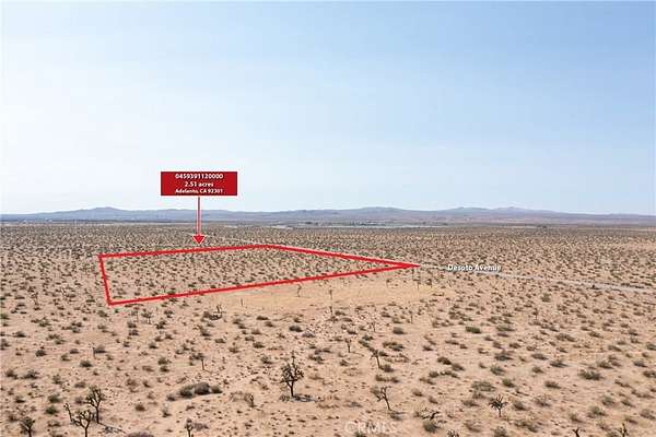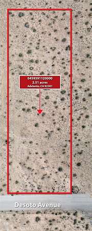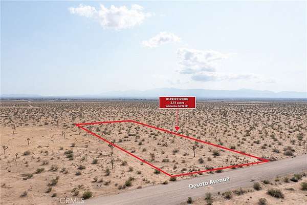 Est $163/moSpacious 2.515-acre lot located on De Soto Avenue in Adelanto, CA. This parcel offers a great opportunity for investment or future development in the growing High Desert area. The property features flat, usable land with plenty of potential. Listed at $25,000 cash only, the seller is highly motivated and ready to make a deal. Don't miss this chance to own affordable acreage in San Bernardino County.