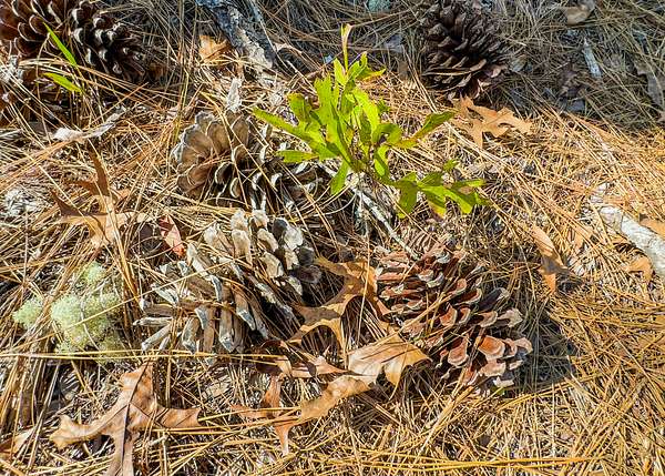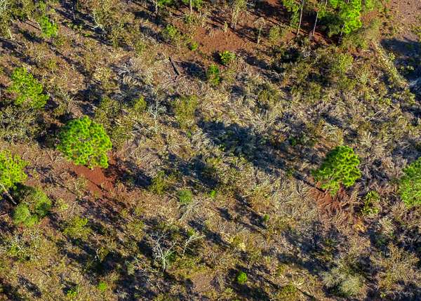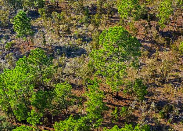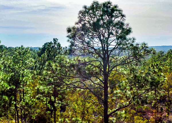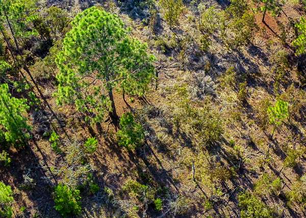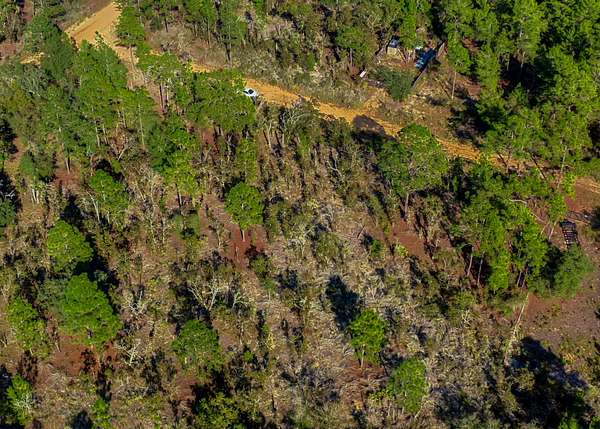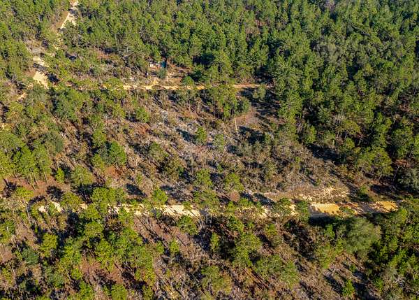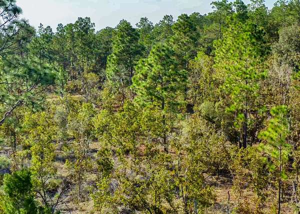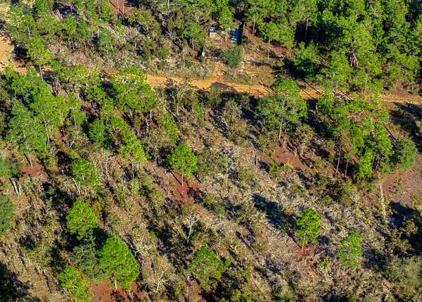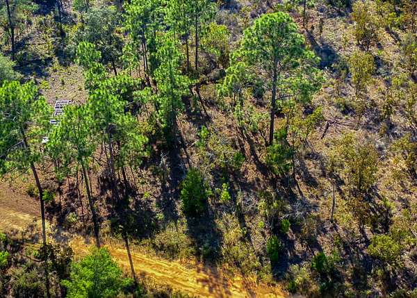 The terrain is gently sloped with patches of pines and open grass, offering a mix of shade and sunlight throughout the property.