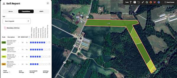 This 24.17+- acre tract is thoughtfully balanced between productive farmland and natural timber, offering approximately 11+ acres of cleared agricultural land, with the remaining acreage comprised of mixed hardwood and pine timberland. This split provides landowners with the best of both worlds--open, tillable acreage ready for cultivation, and wooded land that offers a natural habitat for wildlife, privacy, and recreational enjoyment.