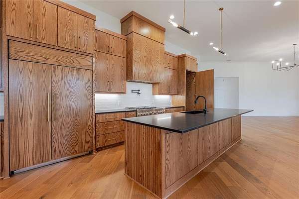At the heart of the home is a chef-worthy kitchen featuring panel-ready appliances, a gas range, built-in ice maker, and a hidden walk-through butler's pantry--all framed by clean lines and natural textures. The open concept living room showcases a stunning 60 in. linear fireplace with floating wood accents and under-lit hearth, creating a warm, modern focal point.