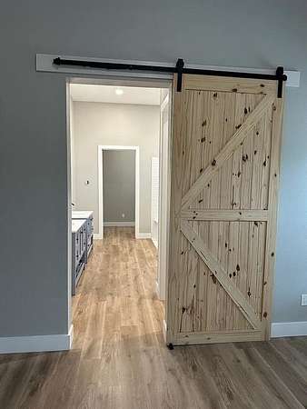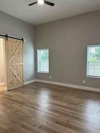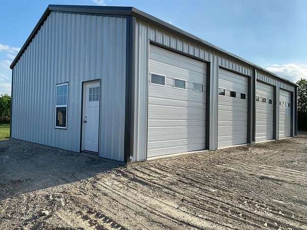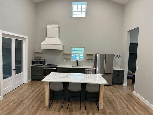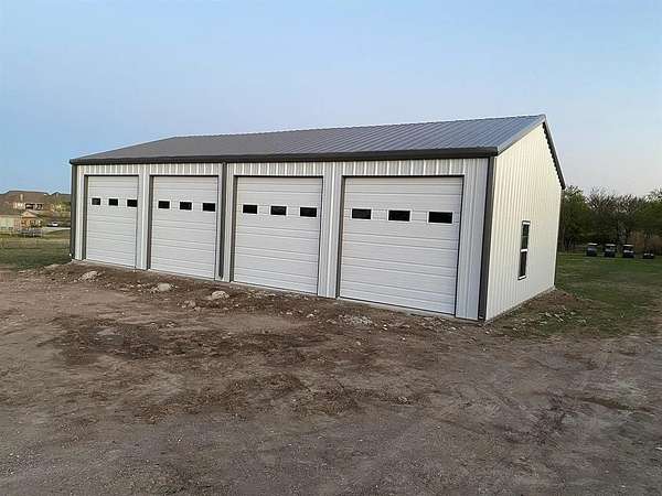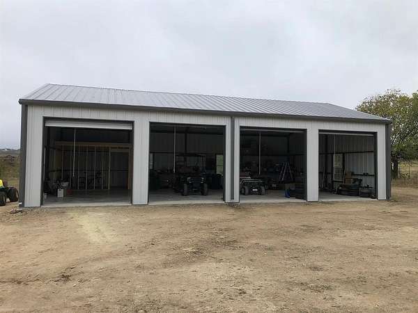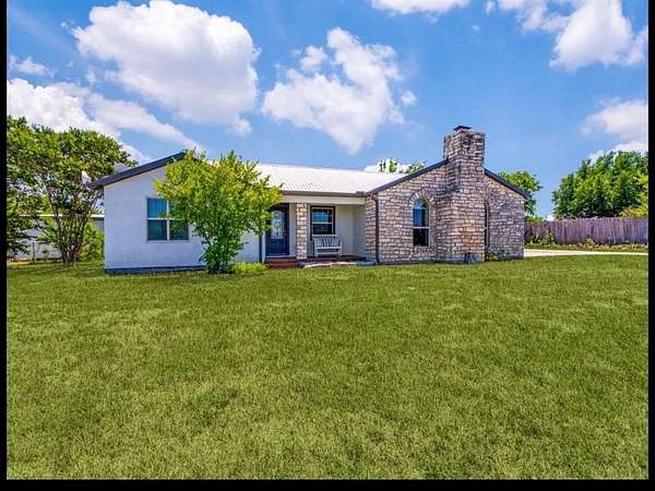 Welcome to modern Texas country living on acreage in highly sought-after Aledo ISD. This 2023 barndominium offers approximately 2,900 sq ft of thoughtfully designed living space on 3.024 acres, blending comfort, functionality, and open space. The open-concept floorplan features a spacious living area and a well-appointed kitchen with a large island, walk-in pantry, solid-surface countertops, utility room off the kitchen, water line to refrigerator, and space for a freezer, ideal for everyday living and entertaining. A dedicated office or flex room off the kitchen offers versatility for remote work, hobbies, or use as an additional bedroom and includes a walk-in closet. The private primary suite features an ensuite bath with built-in cabinetry, dual sinks, separate vanities, a walk-in shower with body sprays, and a walk-in closet. Two additional bedrooms, each with walk-in closets, provide comfortable accommodations for family or guests. Outside, the property features a versatile 1,500 sq ft detached garage-workshop with electric service supporting lighting, outlets, and large equipment, plus epoxy flooring, oversized dimensions-approx. 30 x 50, tall ceilings approx. 12FT. sidewalls and 16FT. peak, gated access, gravel parking, and RV access parking. The building is pre-plumbed for a future bathroom. Enjoy peaceful surroundings with covered front and rear porches, rain gutters, pipe fencing and barbed-wire fencing along the sides and back, and land that is grassed, partially wooded, and horse-permitted. Additional features include luxury vinyl plank flooring, ceiling fans, water softener, private well, conventional septic system, and heat-pump HVAC.