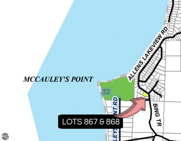 Est $199/moSecluded location near the end of Allen's Lakeview Road. Offering Lots 867 & 868 at one low price! Located in the Port St. James Association. (you can find more information on this association on the PSJ website - www.psja.org) This property is just few steps away from the Kuebler Trail, which also provides Lake Michigan access at McCauley's Point where you can enjoy the beautiful sand beach and sunsets. Picturesque rolling hills and almost an acre to build your island retreat.