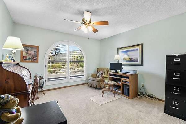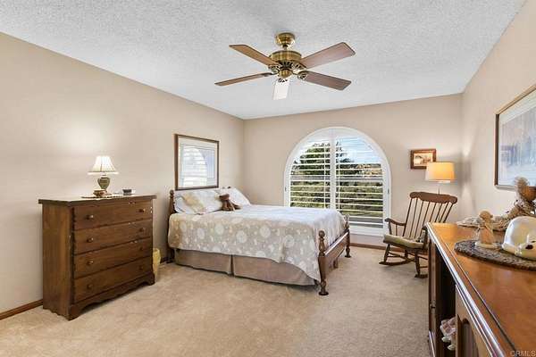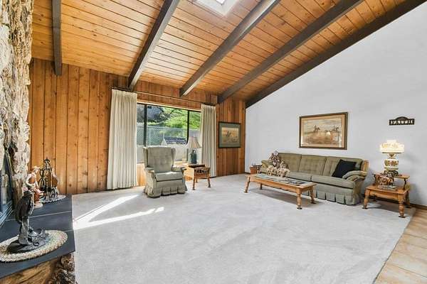 Great value for a single-level home in desirable Palo Verde Ranch. Offering 2,440 square feet of living space all on one level, plus direct access from the garage into the house. The spacious kitchen features abundant storage, a breakfast bar, and opens to the family room with a two-sided fireplace, currently equipped with a wood-burning stove insert. The dining area flows into the living room, showcasing vaulted open-beam ceilings and plush carpeting. The home offers four bedrooms and an updated hall bathroom with dual sinks and a tub. The primary suite is generously sized and includes a walk-in closet, dual sinks, shower stall, and a sliding glass door with direct access to the backyard pool and spa. Situated on two acres of land, the property features a charming pool and spa, a large barn with carport, a storage shed, and additional flat land behind the home. Located on a corner lot in Palo Verde Ranch, residents enjoy access to community amenities including Palo Verde Lake, clubhouse, playground, pickleball courts, volleyball courts, and more. A wonderful opportunity to enjoy space and privacy.