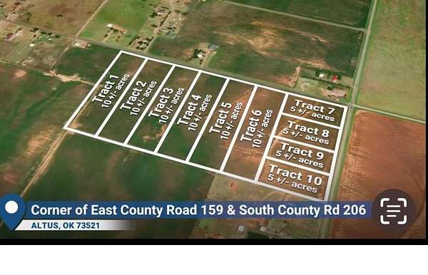 5 +/- ACRES IN ALTUS - COUNTRY LIVING WITH CONVENIENT ACCESS Discover this beautiful 5 acre tract just outside of Altus offering the perfect blend of peaceful country living and everyday convenience. With over 300 feet of blacktop road frontage, the property provides easy, reliable access while maintaining a quiet rural feel. Located just 8 minutes from Walmart and everyday essentials in Altus, you're close enough for convenience while still enjoying the peace and privacy of country living. Electric is available at the road, giving you a head start on building your dream home. The open landscape offers plenty of room for a shop, gardens, or simply enjoying beautiful Oklahoma sunsets. Being less than an hour from the Wichita Mountains, you'll enjoy convenient access to hiking, fishing, scenic drives, and relaxing weekend escapes. With wide open space and room to grow, this property offers the flexibility to build, invest, or create your own country retreat. Lot #7 is a 5 ac tract on Corner of ECR 159 also known as Racetrack and SCR Road 206.. Property has views of mountains to the north and east . Excellent location. Road frontage on east and north sides. No HOA, no restrictions , raw land