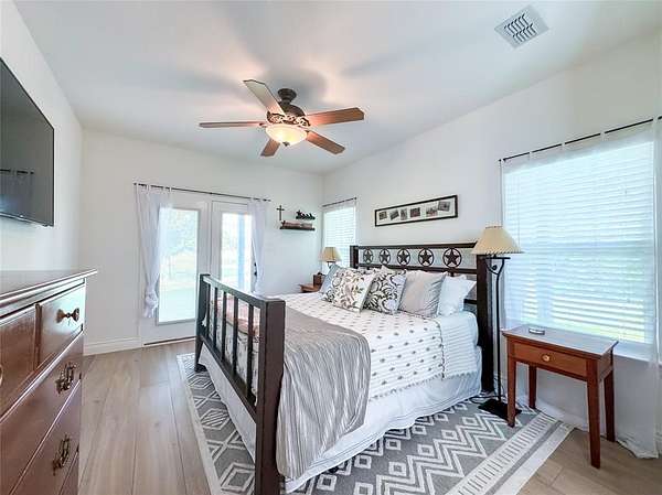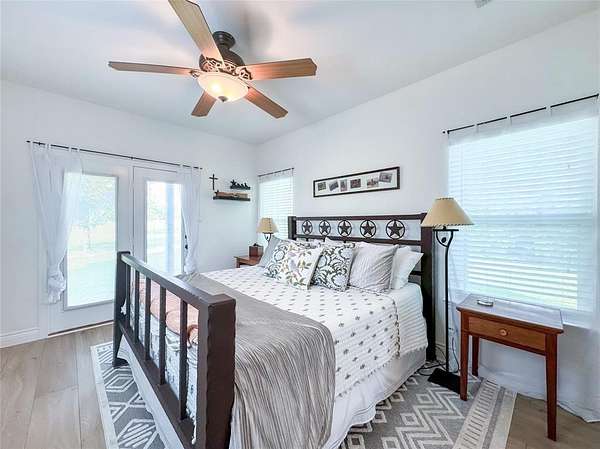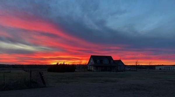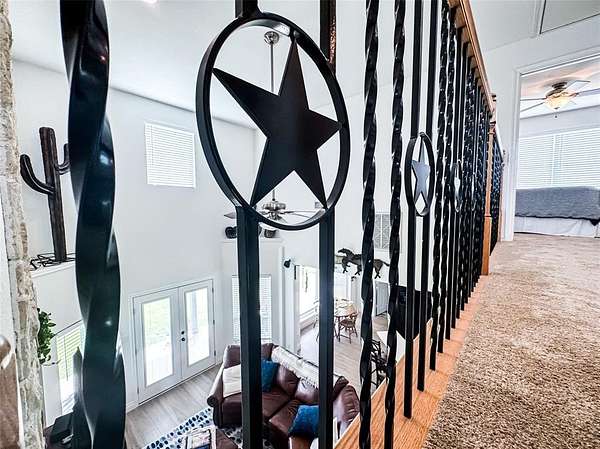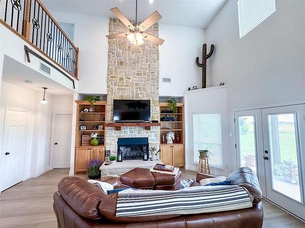 The home sits back off the county road with pipe fencing and a gated drive for plenty of peace and privacy. There are 2 bedrooms upstairs with a full bathroom and the large Primary bedroom is on the main floor with a gorgeous refreshed primary en-suite bathroom. The living area is large and open with a great stone fireplace, high ceilings, and tons of natural light from the all directions. The dinette is perfect for enjoying your morning coffee and taking in your Texas Ranch views from one of many large windows. Enjoy cooking and entertaining from this kitchen with ample counter space featuring new countertops and custom Hickory cabinetry. The dining room just off the kitchen is perfect for sitting down and enjoying a family supper with views of the front acre of well manicured land. Past the home on the driveway take advantage of the tall steel beamed pole barn with space for equipment, tractors, an RV, or clear the way and gather around the outdoor stone fireplace and entertain on the finished concrete floor, perfect for Texas Nights. This is the type of property you can raise a family on and pass down for generations, taking advantage of multiple income potentials, all conveniently located in one of DFW's most developing areas.