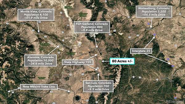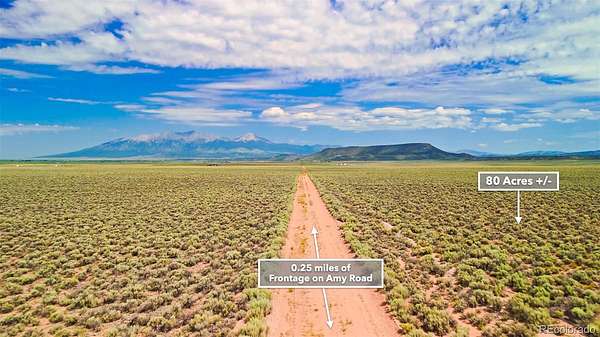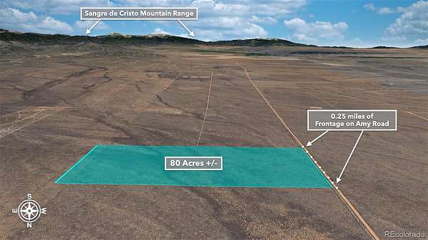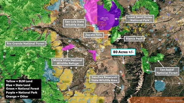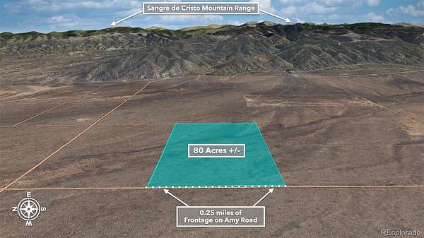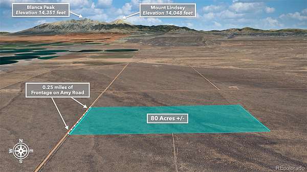 80 Acres of Colorado Land with Road Frontage & Amazing Mountain Views. This property is surrounded by Millions of Acres of Public Land; including National Forests, State Parks, State Wildlife Areas, National Parks & BLM (Bureau of Land Management) Land. The Property has a Quarter Mile of Road Frontage along the entire Western boundary on Amy Road.Electricity lines & poles are approximately in place 0.6 miles Northwest of the Property along Camino Tio Irving. The property is surrounded by breathtaking views of the surrounding mountain including Blanca Peak (elevation 14,351 feet), Mount Lindsey (elevation 14,048 feet) and the Sangre de Cristo Mountain Range. The property has great drive-up access with 0.25 miles of road frontage on Amy Road along the western boundary of the property. Amy Road leads to State Highway 159 which is 19.5 miles southwest of the property. State Highway 159 leads to San Luis, Colorado only 12 minutes from the property. San Luis was established on April 5, 1851 and is Colorado’s oldest town. In San Luis you will find fuel, lodging, Family Dollar, public high school, post office, churches, and a community park. From the property, you are just under an hour to a variety of recreational opportunities, with much more located just beyond an hour away. The property is only 26 minutes from Sanchez Reservoir State Wildlife Area. It sits on 1,462 acres and anglers will find walleye, carp, catfish, pike, and perch there. Learn more here. North of the Property Great Sand Dunes National Park & Blanca Peak feature hiking, sand sledding and fishing.