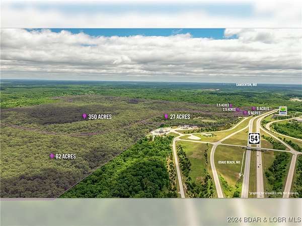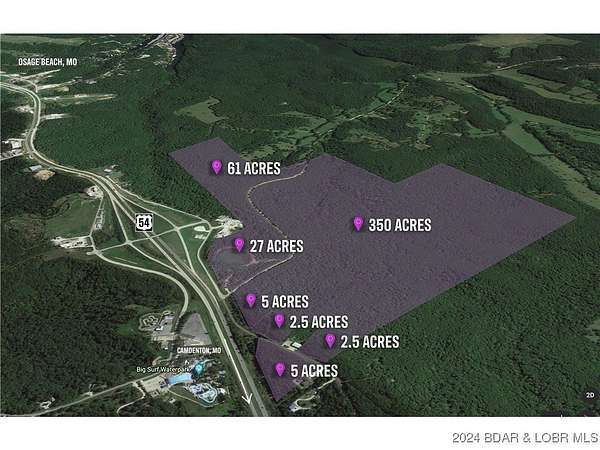 Lake of the Ozarks is growing rapidly. This is 425 acres of prime development ground located perfectly between Camdenton and Osage Beach at one of the few US 54 Expressway interchanges. You just can't find many large tracts of land for sale with this type of location and this opportunity. US Hwy 54 Expressway frontage directly across from Big Surf Water Park, just outside Osage Beach city limits. Easy accessibility, great visibility and an extremely high traffic count make this the perfect spot for Lake of the Ozarks "next big thing". Owner will subdivide or sell as listed package and let a developer control the whole piece. Perfect piece of ground for mixed use with commercial and residential. Topography lends itself well to possibly make some beautiful lakes.