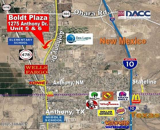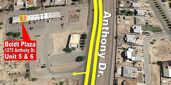 2000 S.F. Space on the Boldt Commercial Plaza next to several anchor businesses. Located in the middle of the city of Anthony, New Mexico. Two ADA Compliance Bathroom, 5 office spaces, Conference room plus reception office. Two entrance doors. Commercial zoned Unit 5 & 6 for Lease. Plenty plaza parking spaces. Easy access to I-10. Between Las Cruces, NM and El Paso, TX.
