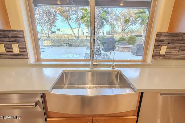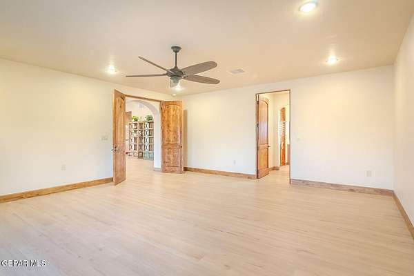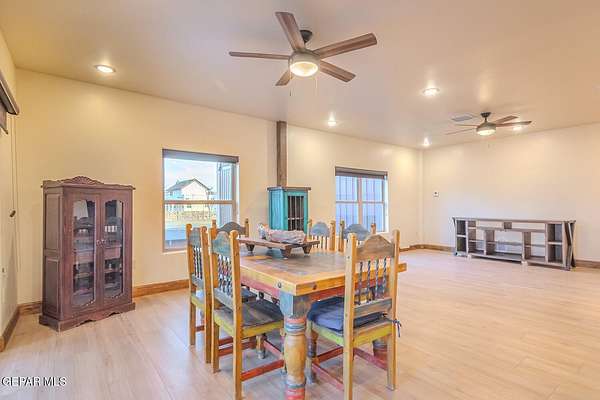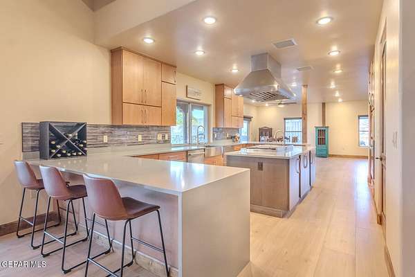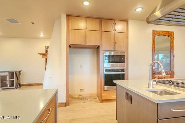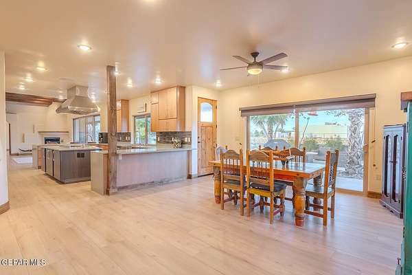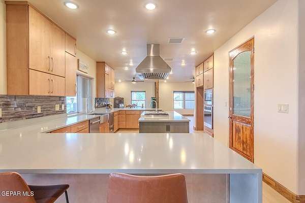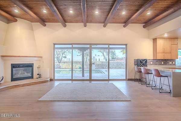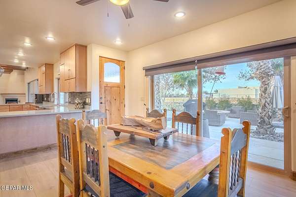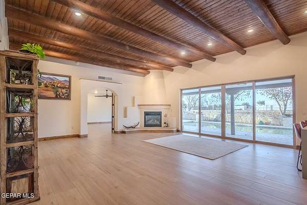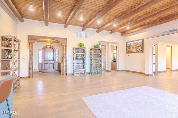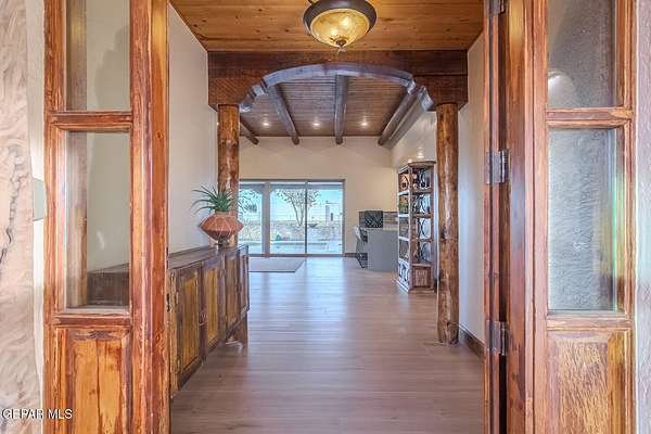 Recently updated home situated within the fly-in community of Cielo Dorado Estates. The foyer and main living area showcase wood ceilings accented with exposed vigas, adding distinctive architectural detail. The open kitchen features quartz surfaces, a Wolf cooktop with dual griddle, custom oak cabinetry extending to the ceiling, recessed and under-cabinet lighting, and two dishwashers. The layout includes a generous primary suite and three additional bedrooms, each with walk-in closets. Exterior amenities include a large patio and a heated saltwater pool. The property offers a six-vehicle garage and airplane hangar combination, with the hangar equipped with refrigerated air for heating and cooling and ceiling fans. Additional features include security shutters, dual reverse osmosis systems, and a newly installed septic system. Approved plans are available for a future casita and an additional hangar.