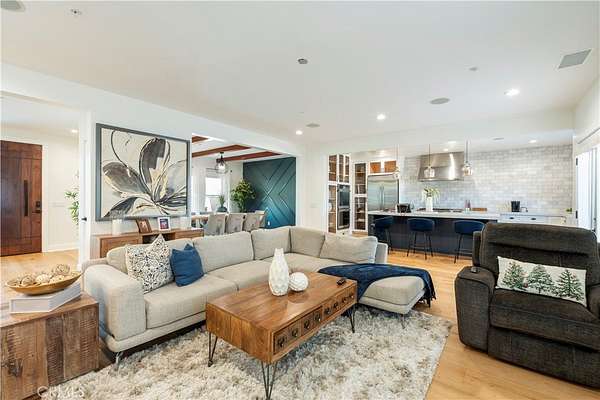 MAIN RESIDENCE HIGHLIGHTS (APPROX. 2901 sq ft.) 4 spacious bedrooms and 3 full bathrooms, including a main level primary suite. A chef's dream kitchen featuring a huge island, high-end Jenn-Air appliances, (including a 6-burner stovetop with grill, double oven, wine fridge, and trash compactor), and elegant quartz countertops. Real wood flooring throughout the main living areas with cozy carpet in bedrooms. Architectural details such as custom accent walls in all bedrooms and wood beams in the formal dining room. A cozy living room fireplace. A spacious 4 car attached garage, providing ample room for vehicles and toys.