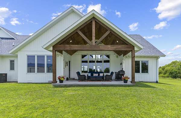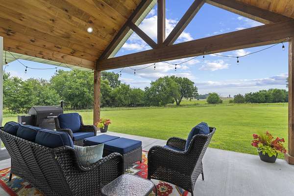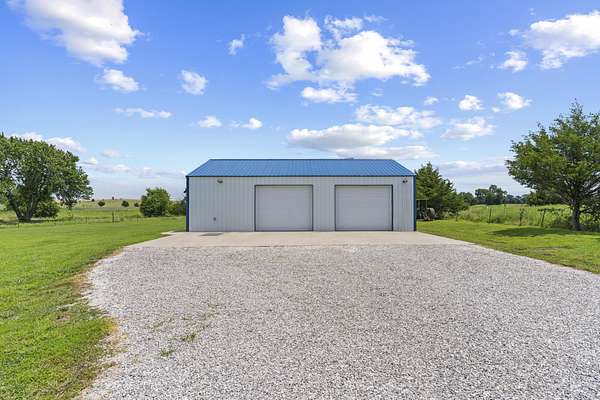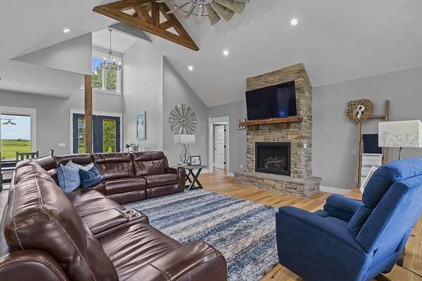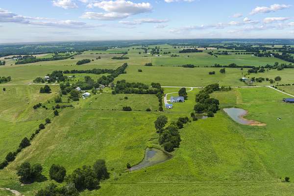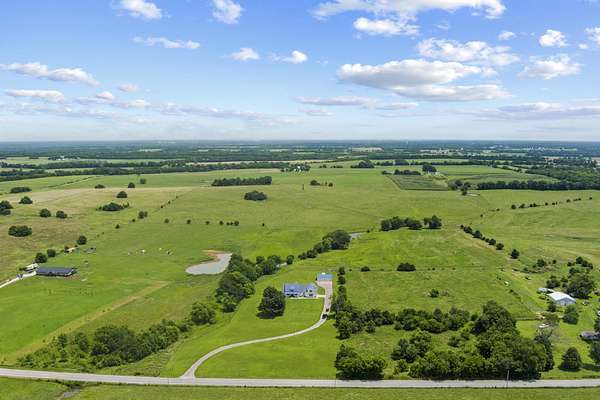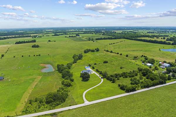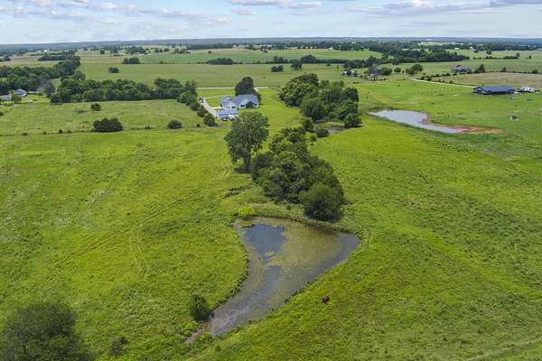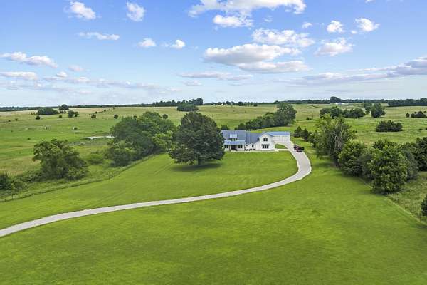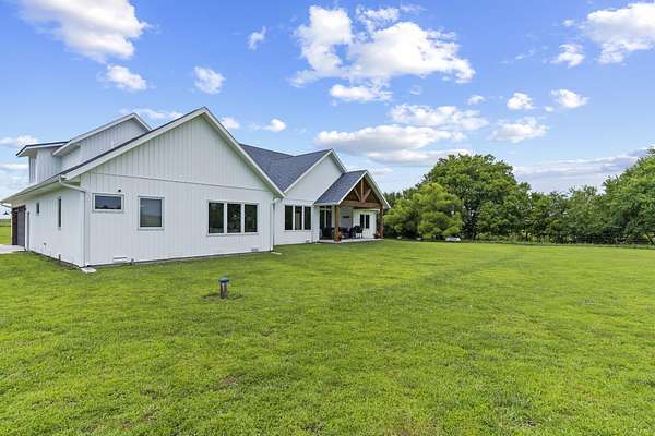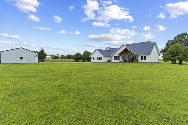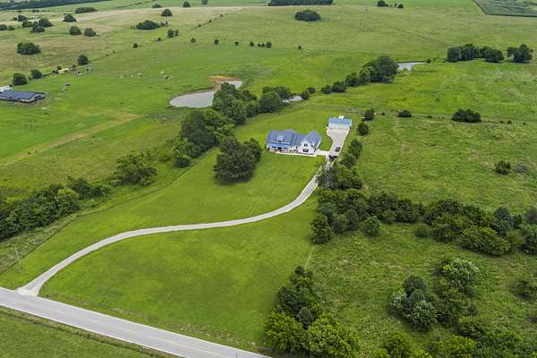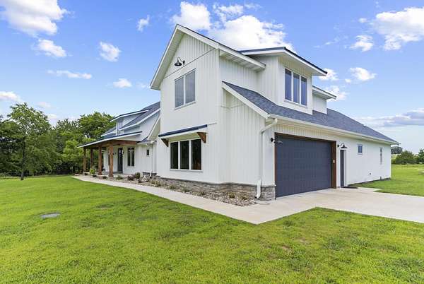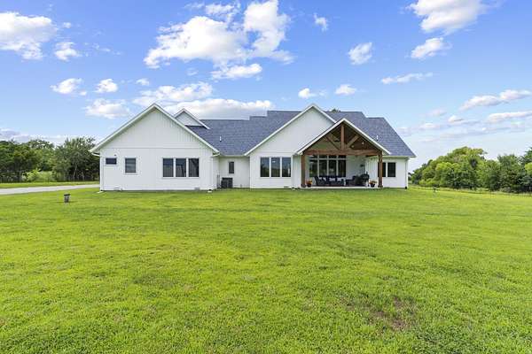 Built in 2022, this custom farmhouse-style home sits on 18 beautiful acres just outside Ash Grove and a short drive to Springfield, offering the perfect blend of modern comfort and peaceful country living. Step inside and you'll immediately appreciate the light filled open floor plan, highlighted by soaring beamed ceilings, hardwood flooring, expansive windows and striking stone gas fireplace. The kitchen was designed with both entertaining and everyday living in mind, featuring a large island, double ovens, abundant cabinetry and a walk-in pantry. The main level includes 3 bedrooms, which includes the primary suite with an oversized walk-in closet, soaking tub and large walk-in shower. Upstairs is a bonus room that works as a 4th bedroom, office or hobby space. Enjoy the tranquility of the countryside from the covered back patio or take in the spectaular sunsets from the welcoming front porch. The 18 fenced acres provide endless possibilities for livestock, recreation or simply enjoying wide open spaces. A 30x49 insulated outbuilding with electricity adds valuable flexibility for a workshop, equipment storage or hobby building. If you're searching for a newer custom home on acreage, this exceptional property delivers.