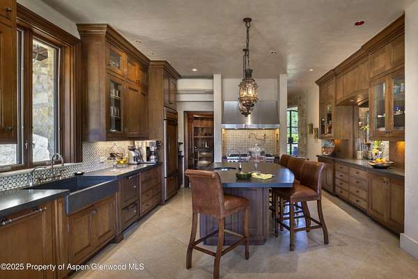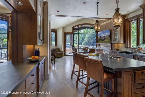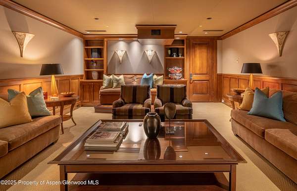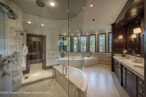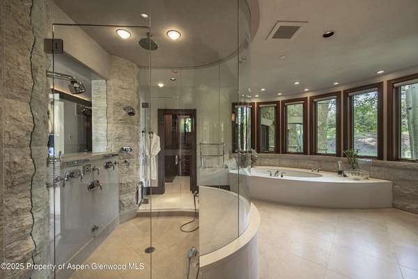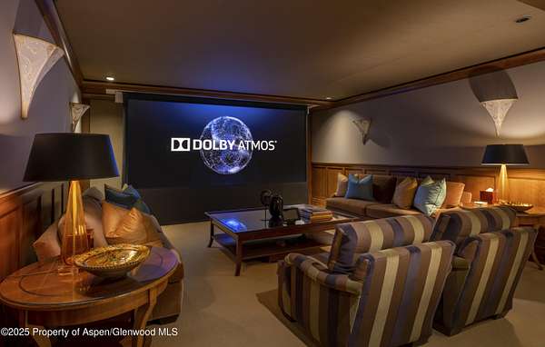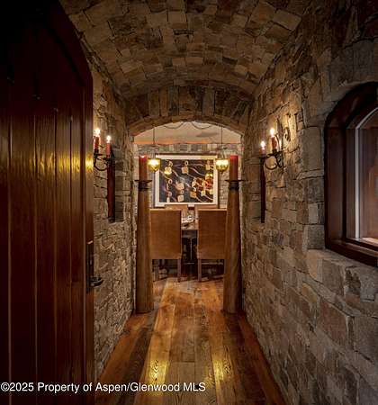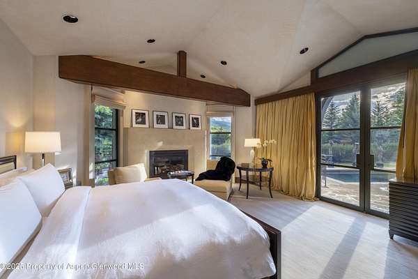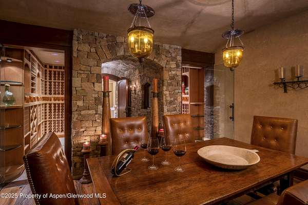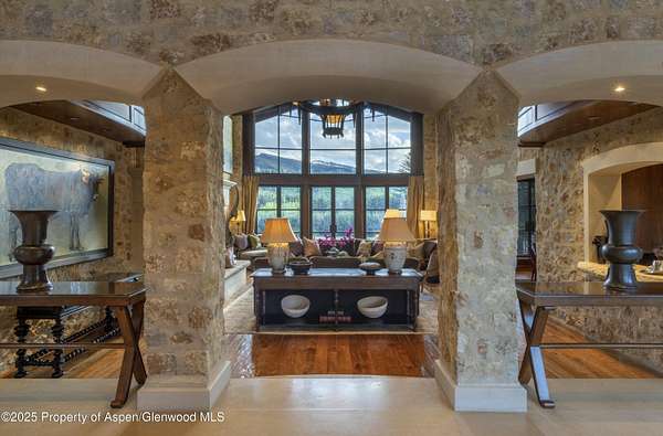 Set on over two private acres in West Buttermilk, this stone-and-wood mountain residence offers sweeping Elk Mountain Range views and seamless indoor-outdoor living. The main level features a light-filled great room with floor-to-ceiling glass opening to an expansive pool terrace, along with a comfortable family lounge and outdoor fireplace and grill. Designed for single-level living, the primary suite includes a spa-style bath, generous closets, and access to the adjoining library, office, and wellness spaces. Five additional en-suite bedrooms provide comfort and privacy for guests. The lower level includes a media room, fitness area, theater, and a stone-lined wine room with tasting space. Rolling meadows and mountain vistas surround the home, creating a peaceful setting minutes from downtown Aspen.