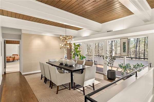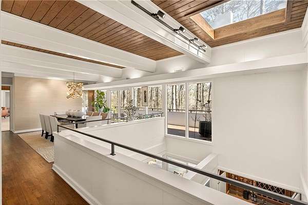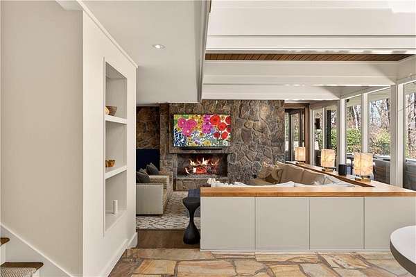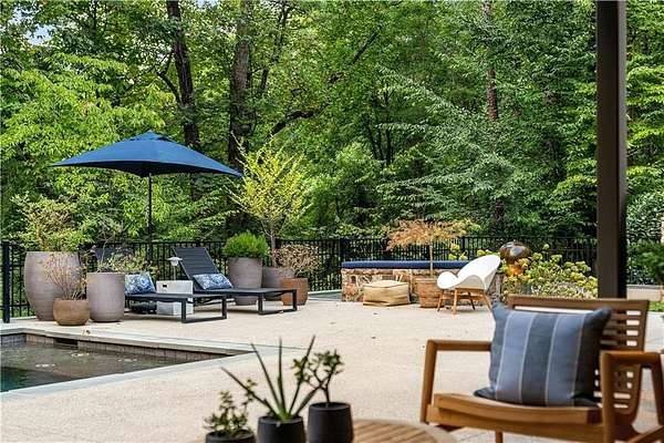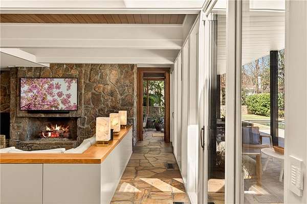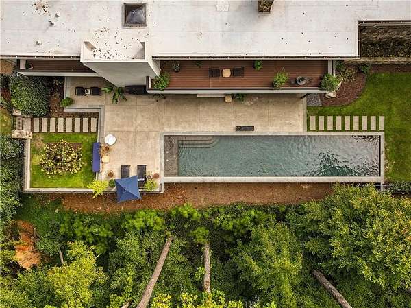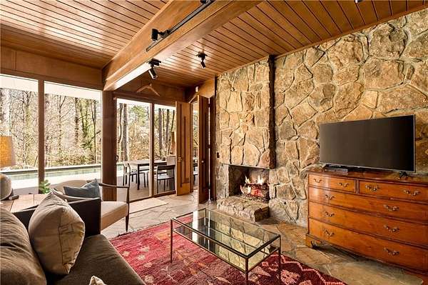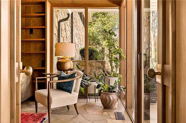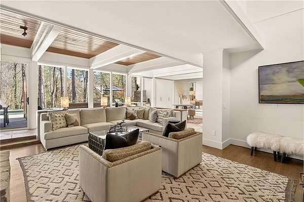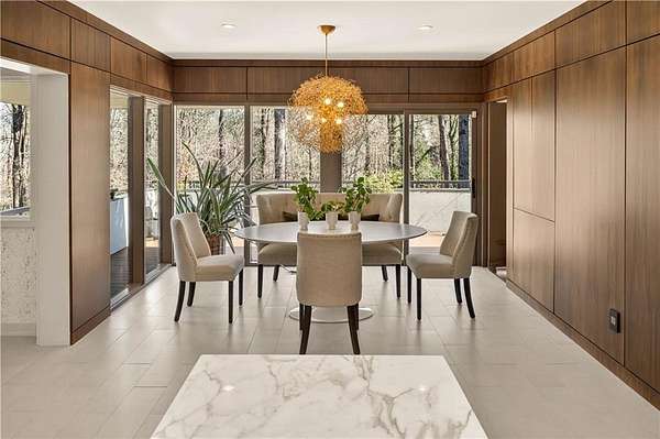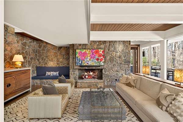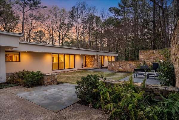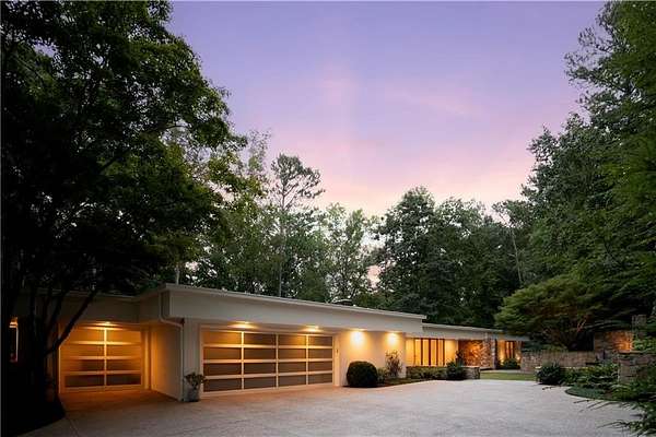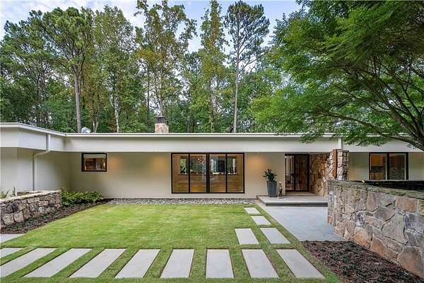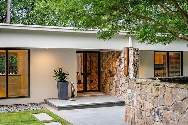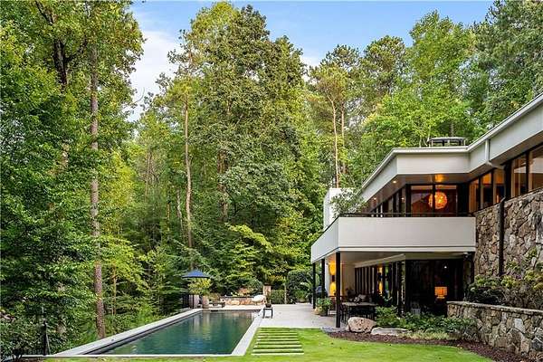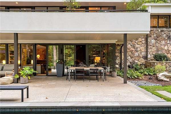 Nestled on an extraordinarily private 2.33-acre estate in the coveted Winterthur community, this architectural jewel is discreetly positioned in the heart of Sandy Springs-offering a rare convergence of provenance, design pedigree, and resort-caliber grounds. Originally conceived as the personal residence of renowned architect Robert Green, protege and direct understudy of Frank Lloyd Wright, the home has been masterfully reimagined under the direction of acclaimed architect Rodolfo Castro-preserving its midcentury integrity while elevating it to a standard of modern luxury. A gated approach and a long and meandering newly constructed driveway set the tone for the arrival experience, framed by extensive, thoughtfully executed landscape and hardscape design by Bellwether Landscapes. The grounds are nothing short of extraordinary-featuring newly installed stone walls, expansive patios, a courtyard terrace with a statement fireplace, an extended level lawn, and a breathtaking 75-foot heated lap pool that anchors the outdoor living experience. Upon entry through striking steel and glass doors, interiors are immediately illuminated by an oversized skylight, casting natural light across the home's refined architectural lines. The fully renovated kitchen is appointed with custom solid walnut cabinetry, Calacatta Gold countertops, and a suite of professional-grade appliances. Seamlessly integrated, the kitchen flows into an inviting breakfast room, a fireside keeping room, and an adjoining office. Four generously proportioned bedrooms reside on the main floor, each served by two impeccably renovated full baths. A dramatic stair hall descends to the terrace level, where the home's architectural character is on full display. Here, original wood paneling has been meticulously preserved, showcased in a vintage wet bar, a raised living area, and a striking sunken family room centered around a stone fireplace with a built-in sectional-an iconic midcentury design moment. The terrace level also hosts a richly paneled fireside den, ideal as a private study or retreat, complete with a newly installed sauna. Tucked away for ultimate privacy, the primary suite is a true sanctuary-featuring dual walk-in closets and a spa-caliber bath with dual vanities, a freestanding soaking tub, and a frameless glass shower, all executed with a refined, contemporary sensibility. Every principal room along the rear elevation opens to the exceptional outdoor environment, blurring the line between interior and exterior living. Expansive patios provide ample space for dining and lounging, while the manicured lawn offers a rare, usable expanse ideal for recreation. With five bedrooms, three full and one half baths, approximately 4,500 square feet, and a three-car garage, this residence represents a once-in-a-generation opportunity to own one of metro Atlanta's most architecturally significant midcentury homes-thoughtfully restored, meticulously curated, and impossibly private.