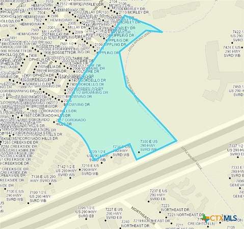 This is a large amount of level acreage ready for development within central Austin. Surrounded by communities it's zoned for office space development, but zoning change could open up opportunities for Multifamily developments, Hospitality developments, or retail. There are many development opportunities in this busy area of Austin, especially considering the recent changes favoring greater density in zoning. It has frontage along E HWY 290 and Coronado Hills Dr dead-ends into the property on the North side. It is very close to the Mueller development with easy access to downtown Austin. This property borders the Austin Achieve Elementary located at Hwy 183 and US 290 and has potential access from US 290. Beautiful Little Walnut Creek runs along the Eastern border of the property and can be a great asset to this large tract. Currently Zoned GO-CO-NP, was previously zoned for Multifamily. Owner/Broker