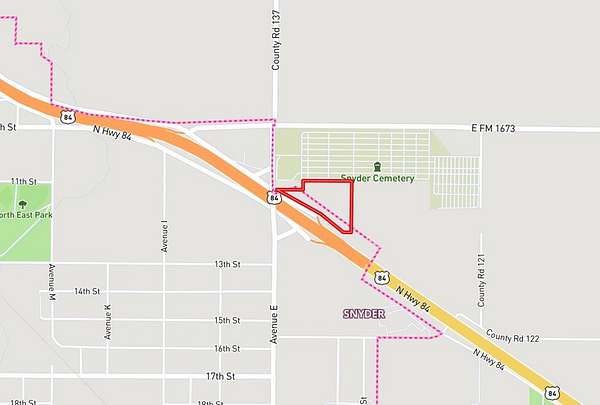 Est $628/mo8.08 acre commercial tract located along U.S. Highway 84 in Snyder, Texas, adjacent to the Avenue E overpass. The property lies partially inside the Snyder city limits, offering added flexibility for development and use. Excellent highway visibility and access with close proximity to downtown Snyder. Gently rolling terrain with native vegetation and nearby utilities. Ideal for commercial, service, or investment development with strong traffic exposure.