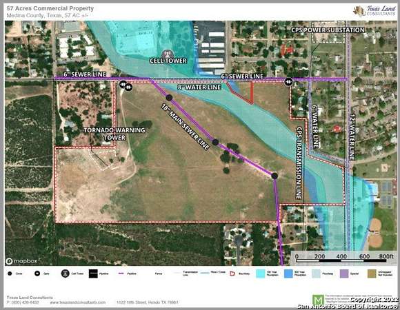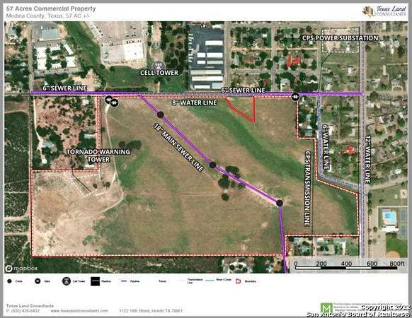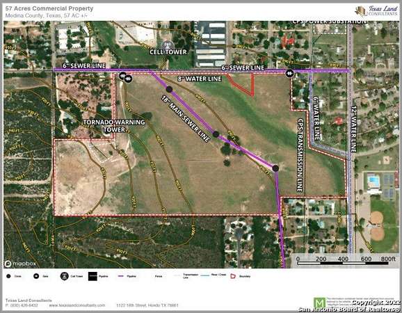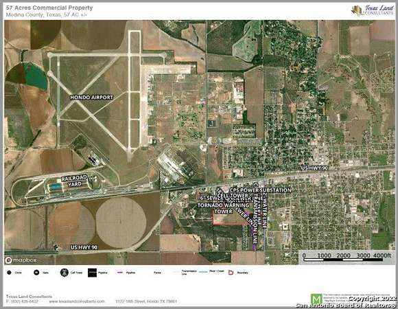 57 +/- Acres all or part, in the city limits of Hondo, Texas zoned PD. The property is Zones "PD" Planned Development Districts Currently in the Hondo UDC Chapter 5.5.1 Purpose is defined as; This district is intended to accommodate unified design of residential, commercial, office, professional services, retail, and institutional uses, and facilities or combinations thereof, in accordance with an approved development plan. This district designed to permit flexibility and encourage a more creative, efficient and aesthetically desirable design and placement of buildings, open spaces, circulation patterns and parking facilities in order to best utilize special site features of topography, size or shape. This property is capable of having a 100MW substation built on site. Located within the opportunity zone Electric substation within 500 feet with main transmission lines crossing the front of the property on the east. Sewer and water are on two sides: o 12" water line on east side, along with a 6" line. o 6" water line on north side o 8" sewer line north side o 18" main sewer line crosses the property Three phase electric is on two sides. ATT cell tower within 100 feet on north side of property Within two miles from Hondo Municipal Airport. Less than two miles from Railroad yard. US Hwy 90 is less than 1,000 feet 45 minutes from downtown San Antonio