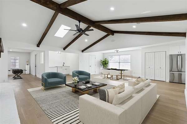 Nestled on a sprawling 10-acre lot behind a gated entrance, this stunning four-bedroom home has been completely remodeled in 2025! Offering a brand-new interior with modern luxury throughout. Just completed and move-in ready, this exceptional property is designed for both comfort and entertaining. Step inside to an impressive living room featuring vaulted, beamed ceilings, a striking white brick fireplace flanked by built-ins, and a stylish wet bar complete with a beverage fridge and sink, perfect for hosting. Rich luxury hardwood floors and crisp white walls create an inviting, contemporary ambiance. The open-concept design seamlessly connects the living, dining, and game areas, making this home ideal for gatherings. The spacious dining area easily accommodates a large table and chairs, while the gourmet kitchen impresses with white cabinetry, all-new stainless steel appliances, including an electric range with a vent, beverage fridge, refrigerator, and dishwasher, plus a sleek white tile backsplash. A generously sized game room opens to the backyard, enhancing the home's entertainment potential. A full-size utility room with built-in cabinetry adds convenience. Additionally, a private study offers the flexibility to serve as a guest bedroom. The expansive primary suite boasts an en-suite bath with dual vanities, a separate shower, and a walk-in closet. The spacious guest bedrooms ensure comfort for family and visitors alike. Beyond the home, the outdoor space presents endless possibilities. A charming gazebo with a large deck, a storage shed, a barn, and a four-car garage await your creative touch. With this sought-after location and a completely updated home, this estate is a rare find!