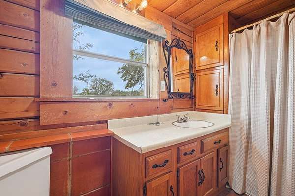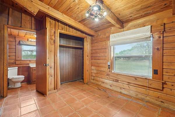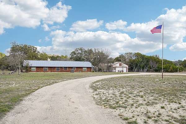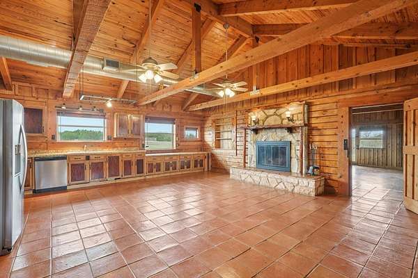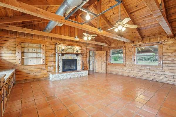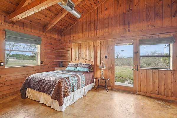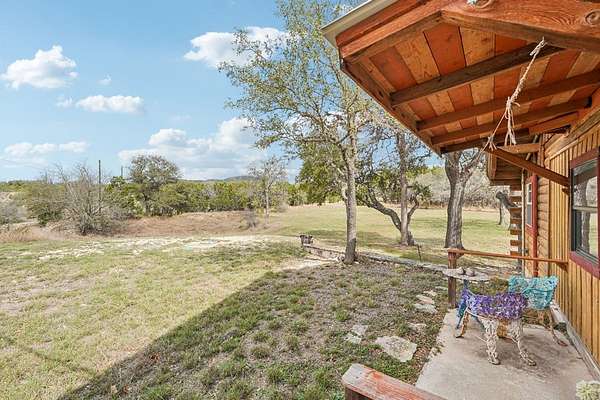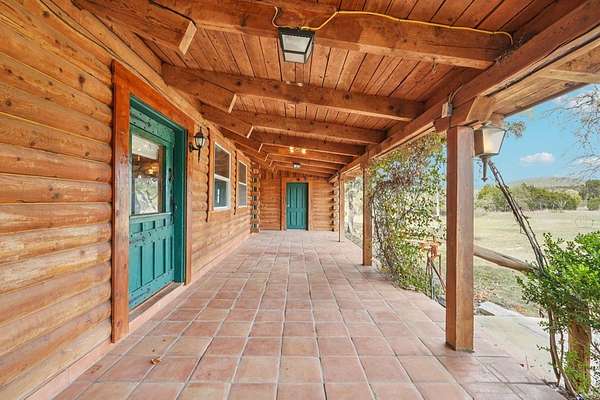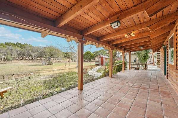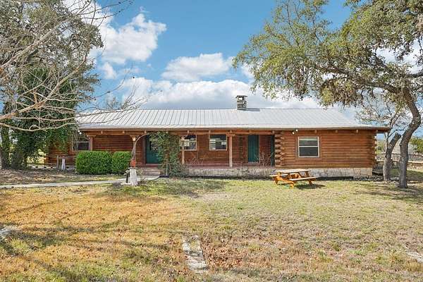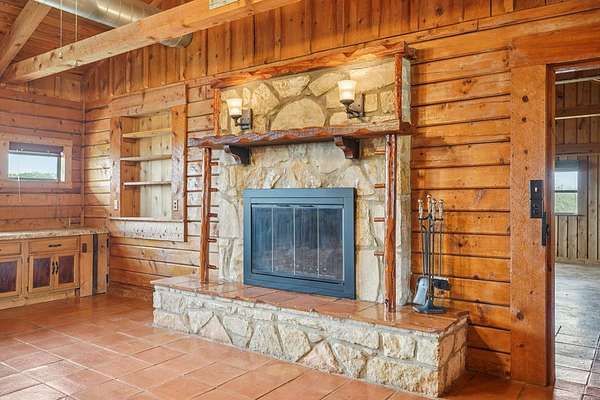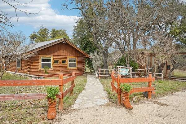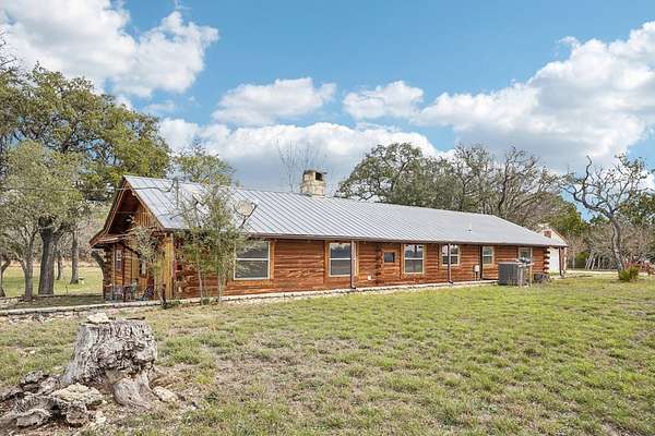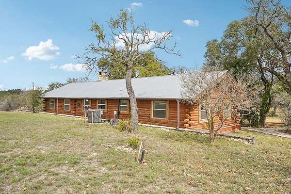 AUTHENTIC PONDEROSA PINE LOG HOME, offering the warmth and durability of true log construction with natural insulating properties that help maintain comfortable temperatures year-round. Interior features exposed wood walls, ceilings, beams, trim, and built-ins throughout with no sheetrock. Vaulted ceilings, Saltillo tile floors, oversized solid wood entry doors, deep windowsills, solid wood cabinetry, and a wood-burning stone fireplace with double mantel highlight the living area. The expansive primary suite includes a separate entrance, stained concrete floors, wood-burning stove, and tankless on-demand hot water heater. Major updates in the past 2-4 years include HVAC, septic system, double-pane windows, well pump with backup, galvanized fencing, chip seal driveway, automatic gate opener, and leaf guard gutters. Set on approximately 2.56 acres with seasonal creek and retention pond, garage/workshop with lofted storage, tractor parking, greenhouse potting area, and outdoor playhouse. Peaceful country living just minutes from Bandera, Medina, Camp Verde, Comfort and Kerrville.