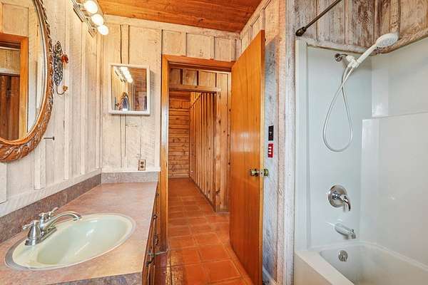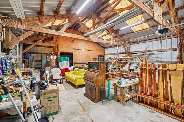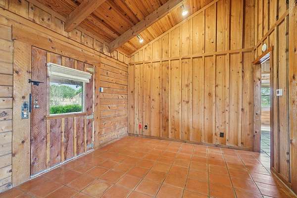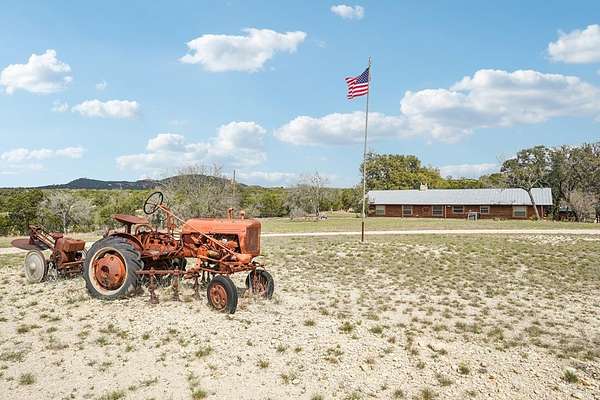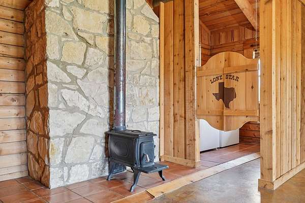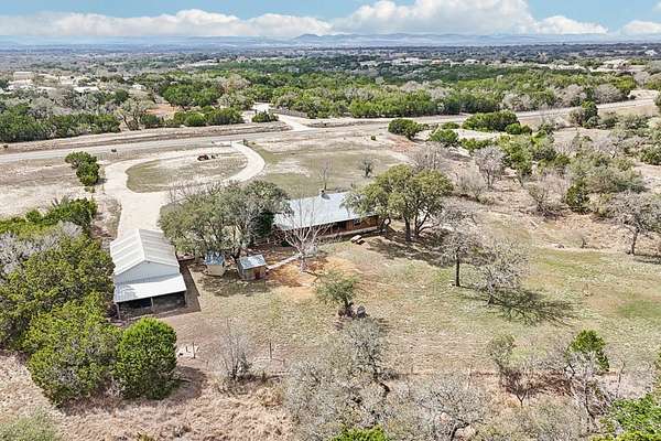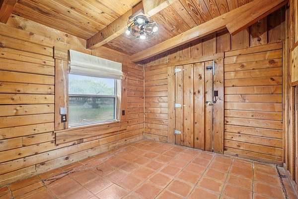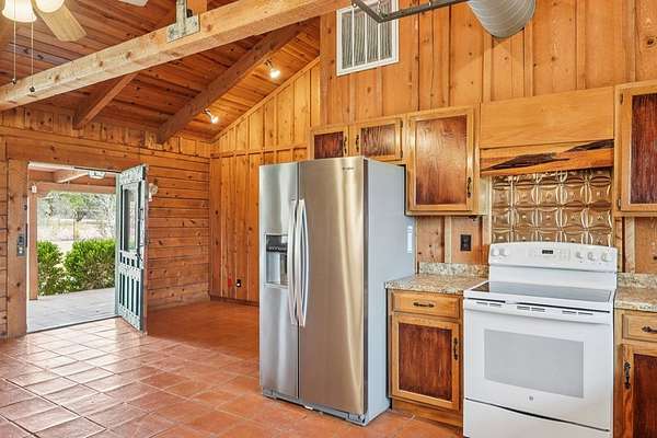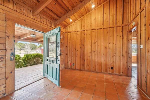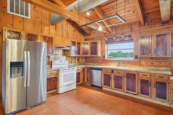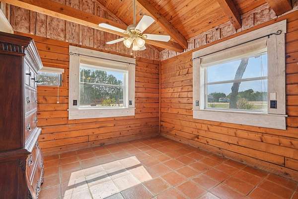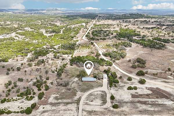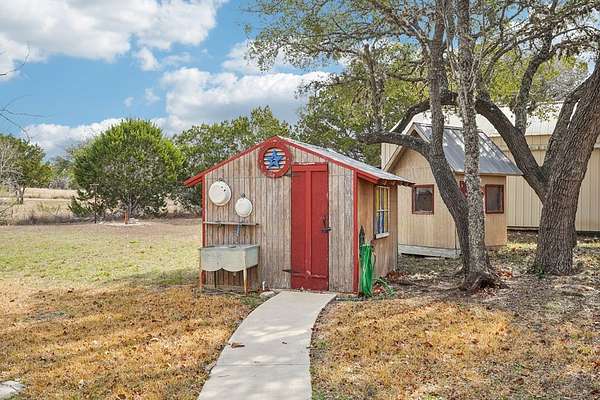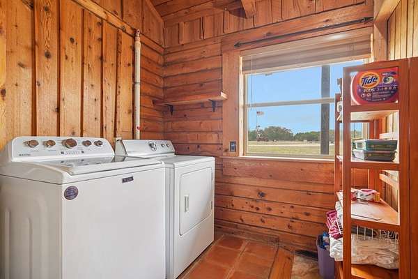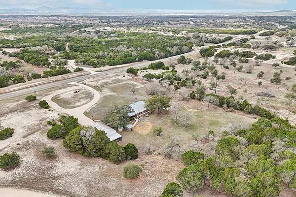 AUTHENTIC PONDEROSA PINE LOG HOME, offering the warmth and durability of true log construction with natural insulating properties that help maintain comfortable temperatures year-round. Interior features exposed wood walls, ceilings, beams, trim, and built-ins throughout with no sheetrock. Vaulted ceilings, Saltillo tile floors, oversized solid wood entry doors, deep windowsills, solid wood cabinetry, and a wood-burning stone fireplace with double mantel highlight the living area. The expansive primary suite includes a separate entrance, stained concrete floors, wood-burning stove, and tankless on-demand hot water heater. Major updates in the past 2-4 years include HVAC, septic system, double-pane windows, well pump with backup, galvanized fencing, chip seal driveway, automatic gate opener, and leaf guard gutters. Set on approximately 2.56 acres with seasonal creek and retention pond, garage/workshop with lofted storage, tractor parking, greenhouse potting area, and outdoor playhouse. Peaceful country living just minutes from Bandera, Medina, Camp Verde, Comfort and Kerrville.