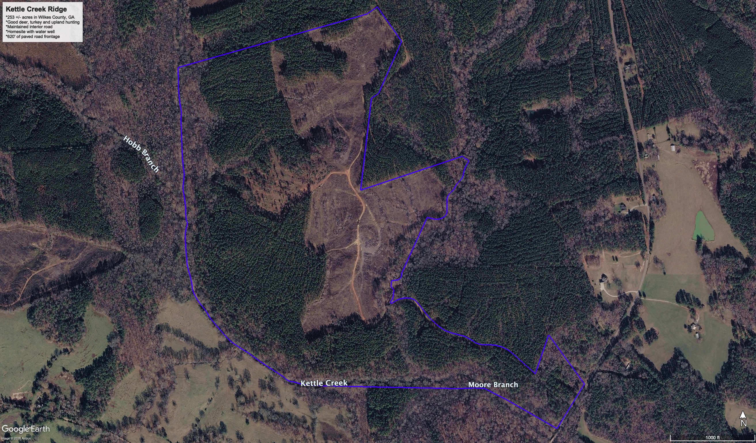 Kettle Creek Ridge is an ideal property to set up your hunting getaway or to build your dream homestead. This land has excellent potential. Located in game-rich Wilkes County, Georgia that is known for high deer density. Terrain is gently rolling. Pine timber was clear cut in 2024-25. Hardwoods remain along Kettle Creek and in watershed drainages. Excellent deer and upland game hunting. Interior roads are maintained and navigable.