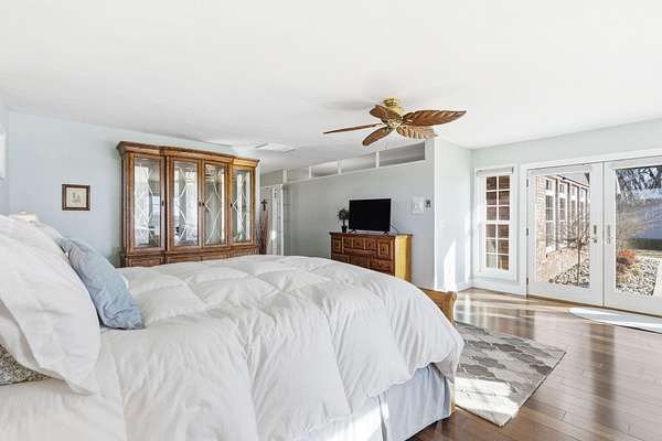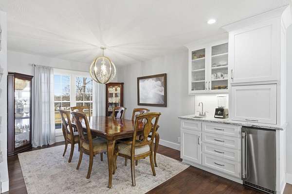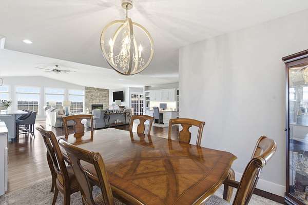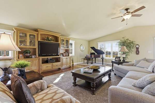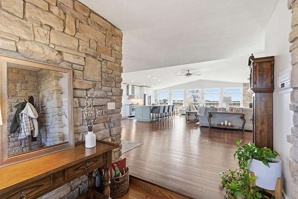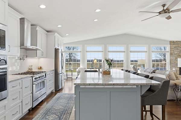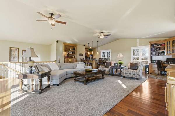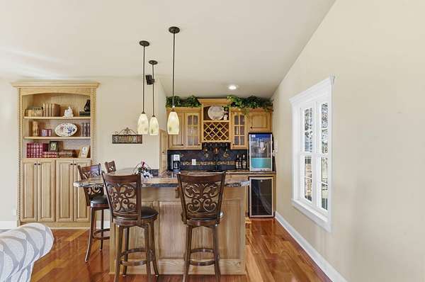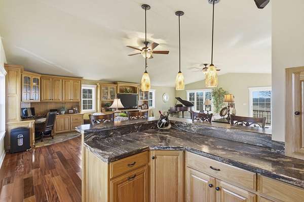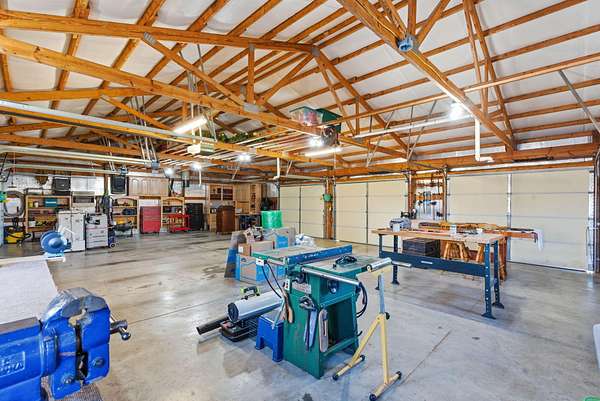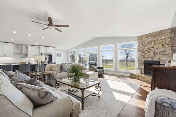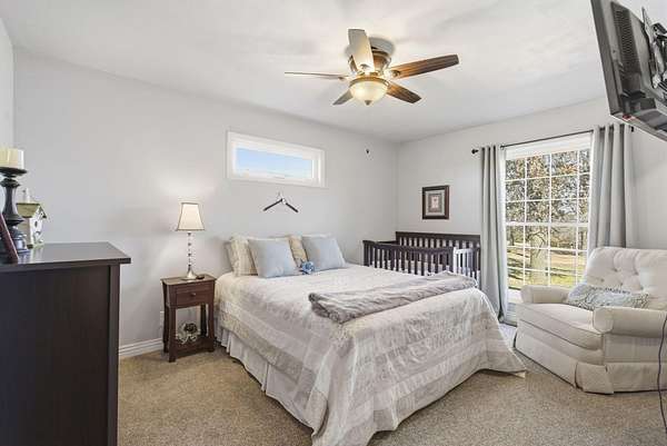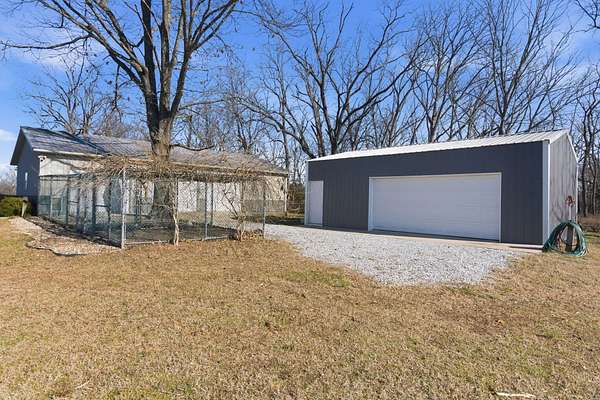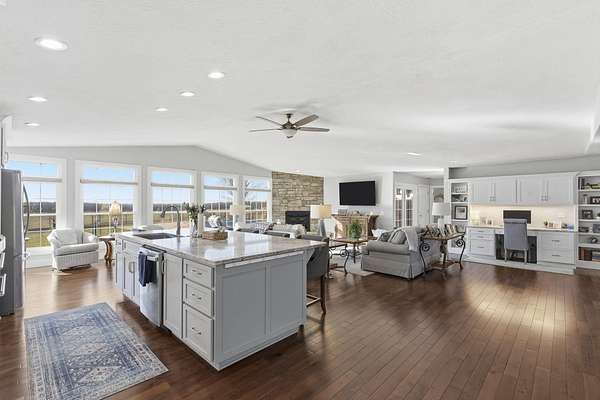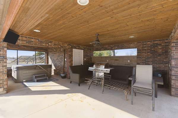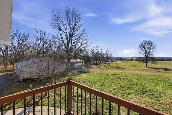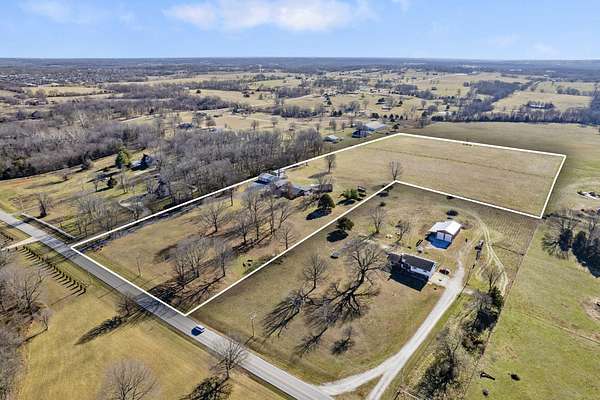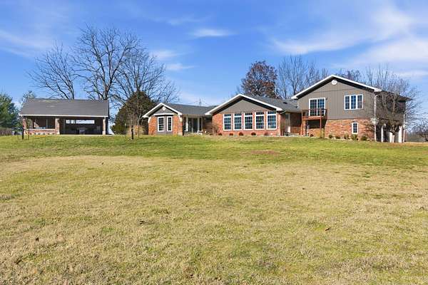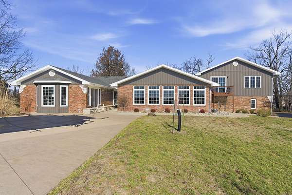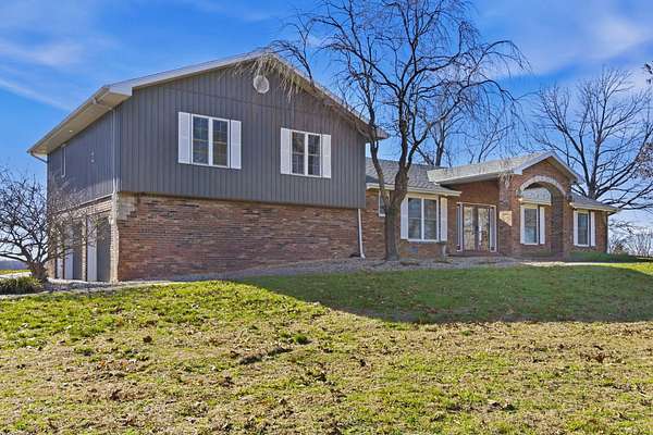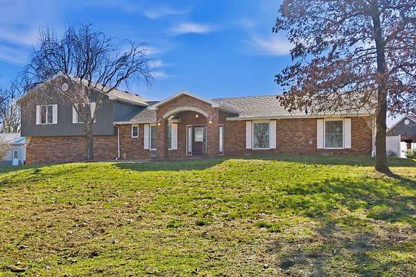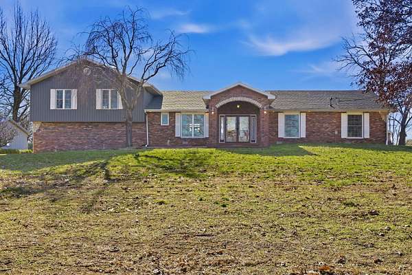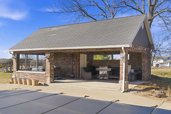 Set on 9.91 acres in Battlefield, this updated all brick 3 bedroom, 3 bathroom home offers privacy, a pool, and exceptional shop spaces. A brick covered entry welcomes you into the great room featuring vaulted ceilings, walnut flooring, a corner gas fireplace with stone surround, built in office space, and a wall of windows overlooking the acreage. The kitchen offers stainless appliances including a gas range, granite countertops, a large island with barstool seating, and a coffee bar within the adjacent dining room, ideal for entertaining and small appliance storage. The primary bedroom features wood flooring, a sitting area with bay windows, and exterior access to the back patio. The primary bathroom includes a dual sink vanity, jetted tub, walk in shower, and walk-in closet. Two additional bedrooms and a full bathroom complete the main level, along with a laundry room offering extra cabinetry and attic access. Upstairs is an impressive second living area over the garage with custom built ins, a full wet bar with barstool seating, and a third full bathroom, making it an ideal guest retreat. A partial basement includes a gym room that could easily serve as a home office. Outdoor amenities include a saltwater pool with new liner and cover, pool house with changing room and covered patio for grilling, balcony with composite decking, and a dog kennel. The property features two shops, including a 30x40 insulated outbuilding with concrete floors, plumbing, and 220 electric. Additional highlights include an oversized heated and cooled two car garage with built in storage, ground source heating and cooling with two zone HVAC, water filtration system, propane, and an approximate electric bill of $70 per month. Solar panels are negotiable. Hot tub is reserved.