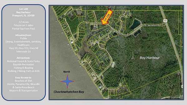 .57 Acre Lot NOW AVAILABLE! Live your best bayside lifestyle in Bay Harbour, Freeport Florida's premier Choctawhatchee Bay front neighborhood! Bay Harbour boasts 106 private, custom, homesites, 175 acres of nature preserve and a neighborhood boardwalk to the bay with a dock and pier. Enjoy hiking trails, tennis courts, owners boat & RV storage and meticulously maintained and manicured green space included with and HOA fee of only $600. Annually. No build out time, your choice of builder and 1,500 square foot minimum build requirement makes lot 108 particularly desirable. Bay Harbour is a premier choice with easy access to The Gulf of Mexico, beaches, boat launches, and state and national parks. Enjoy everything the Emerald Coast has to offer!
