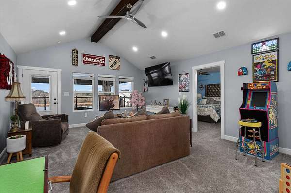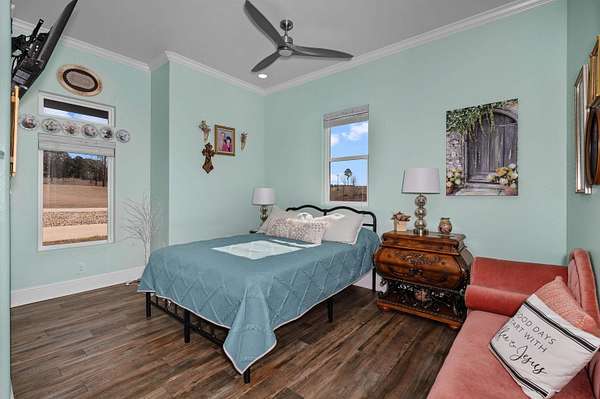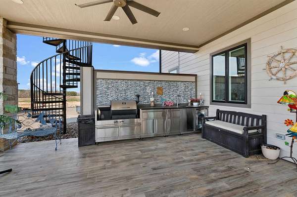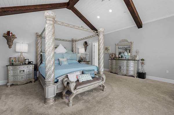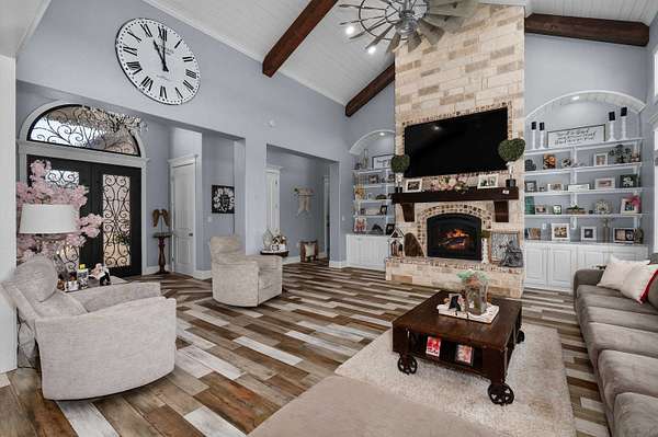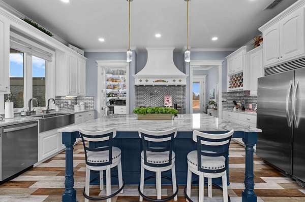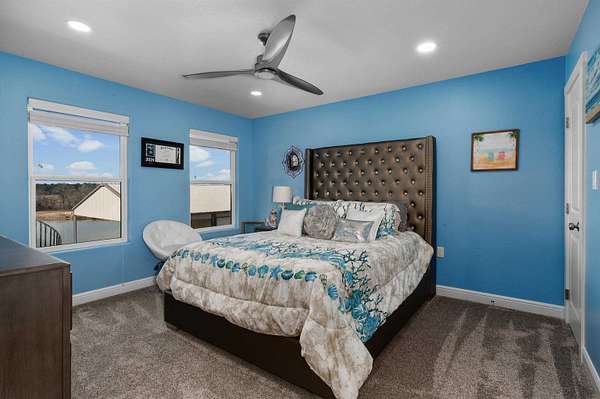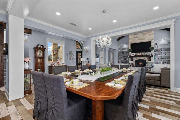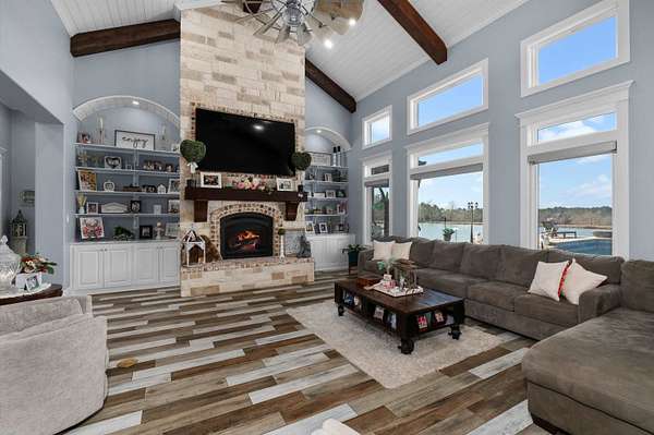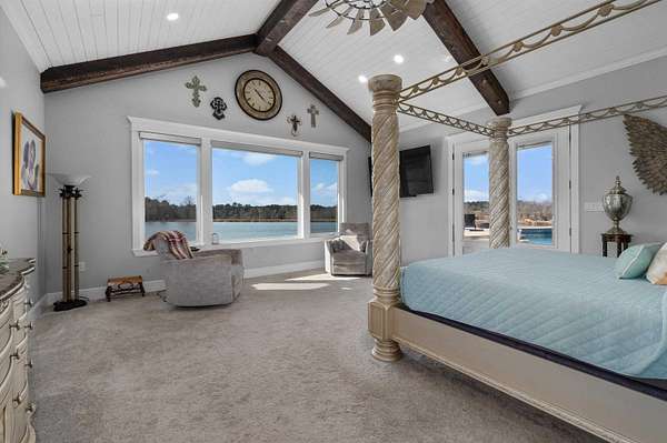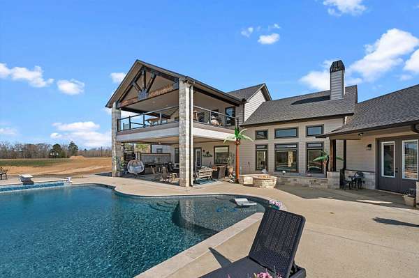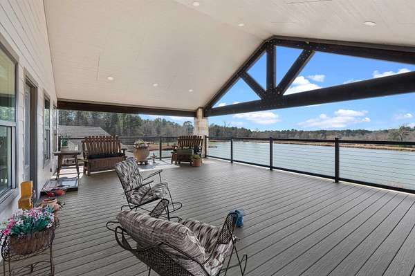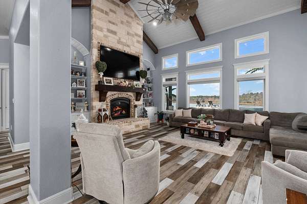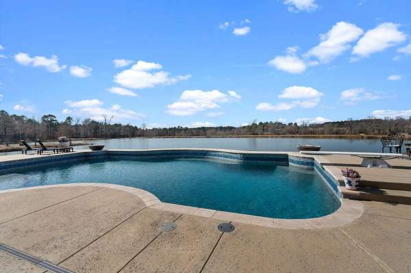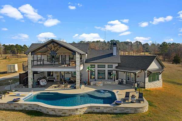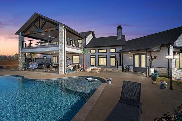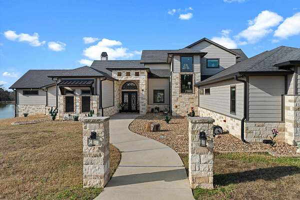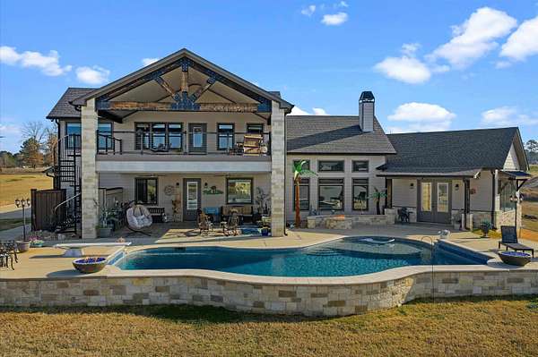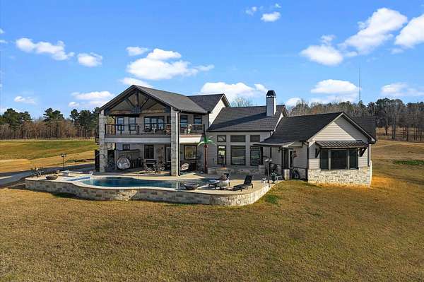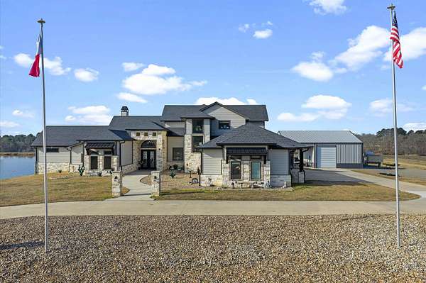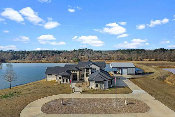 Welcome to your private East Texas retreat overlooking a breathtaking 13.5-acre private lake. Built in 2020, this spectacular property offers panoramic water views from nearly every angle of the home, where peaceful breezes and unforgettable sunsets create the perfect backdrop for everyday living. Home comes with 5 acres. Designed for both comfort and entertaining, the heated and cooled pool is complemented by three outdoor fire pits--ideal for gathering with family and friends year-round. The property is equipped with an impressive 85KW diesel generator and a 6-inch water well, providing efficiency and peace of mind. The main home features four bedrooms and 3 1/2 baths, including a flexible downstairs office that could serve as an additional bedroom. The large open-concept living area showcases a stunning floor-to-ceiling stone fireplace and expansive picture windows overlooking the backyard and lake. The chef's kitchen is built for entertaining, offering a large island with storage and additional seating, pot filler over the gas stove, double sinks with dual faucets, and a dedicated prep kitchen/pantry for all your accessories. Abundant storage throughout ensures everything has its place. The primary suite is a private sanctuary with vaulted ceilings, dual vanities, a soaking tub, and a spacious walk-in shower. Upstairs includes two bedrooms, and 2 full bath, a generous living area, and a large flex room perfect for a craft room, bunk room, or additional bedroom. Step outside onto the expansive upper deck and take in the sweeping lake views. An attached mother-in-law suite provides complete privacy with its own kitchen, living area, bedroom, and full bath--perfect for guests or multi-generational living. For hobbies or business needs, the 30x48 enclosed shop with an 18x48 awning offers ample space for equipment, projects, or storage. This exceptional lakefront property blends luxury, functionality, and serene country living--all in one remarkable home