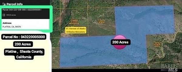 Rare 200-acre off-grid property offering exceptional privacy, usable terrain, and long-term potential. Access is secured through a recorded easement via Saint Herman Monastery, leading to the interior of the parcel and two identified building areas of approximately 6 acres each with slopes under 30. These sites provide options for future development, cabins, or retreat structures. The land features seasonal creeks, rolling hills, mountain contours, valley areas, and wide panoramic views. Vegetation throughout the property includes chaparral, oak woodland, native grassland, and scattered conifer influence, creating a diverse natural environment. The property also borders BLM land on three sides, offering an expansive buffer of open space and additional recreational possibilities. This acreage supports a variety of potential uses, including homestead development, recreational activities, off-grid living, agricultural pursuits, conservation, or long-term land investment. Wildlife is present throughout the area, and the varied topography provides opportunities for hiking, camping, and exploration. With significant acreage, recorded access, and multiple buildable areas, this property represents a unique chance to secure a large piece of rural Northern California terrain. A rare offering with a combination of natural beauty, privacy, and versatility.