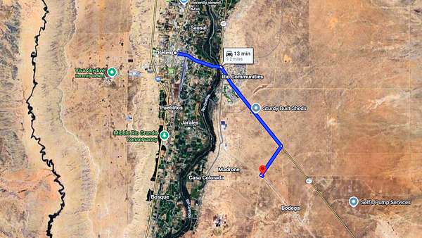 Location highlights include close proximity to Albuquerque amenities, the Rio Grande Valley, Middle Rio Grande Conservancy irrigation canals, Walmart Supercenter, Tierra Del Sol Golf Club, Black's Smuggler Winery, Harvey House Museum, and Viva Skydive, all just minutes away.