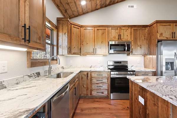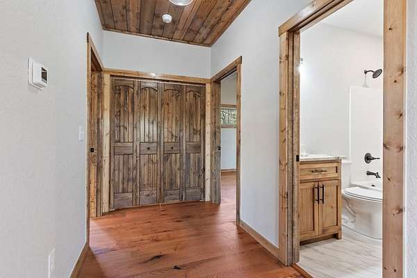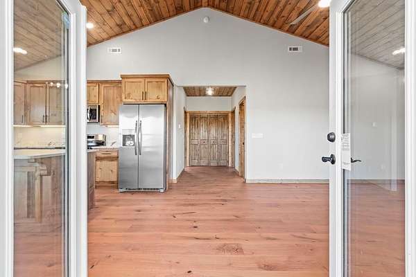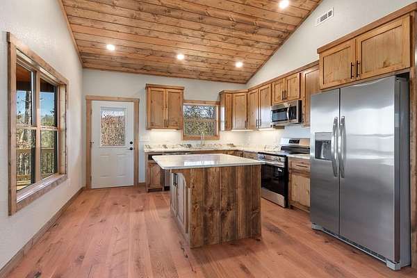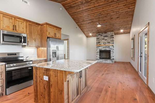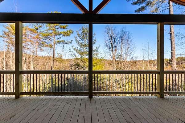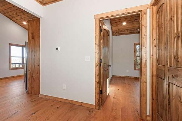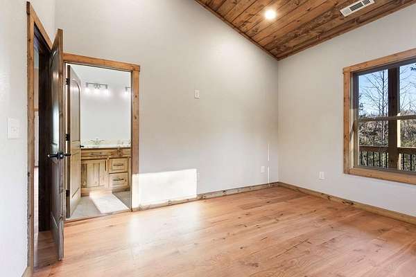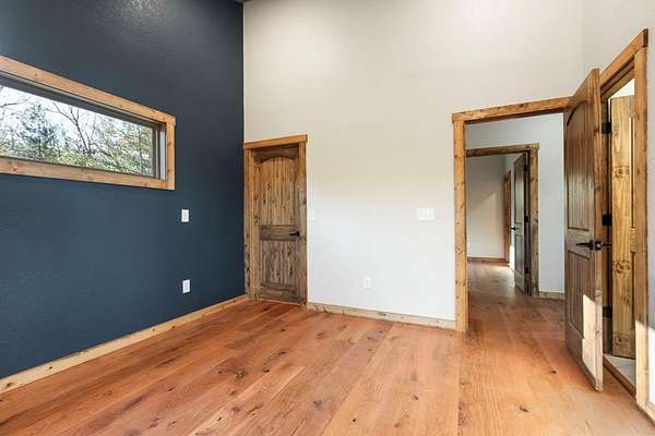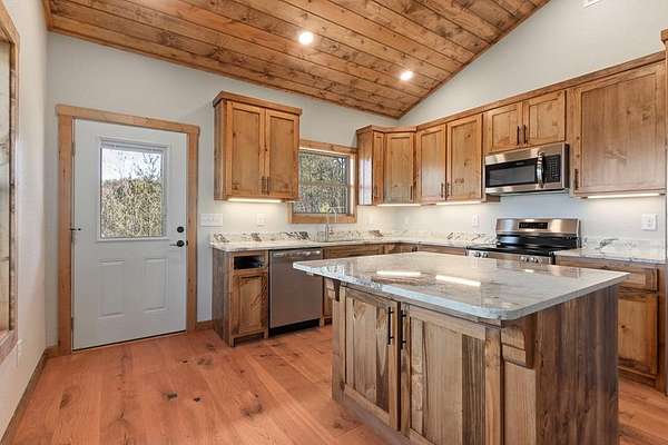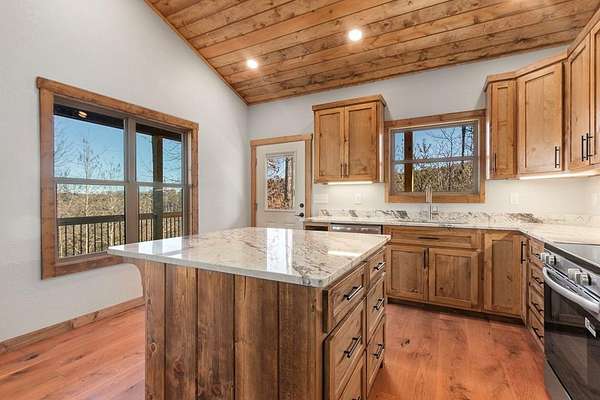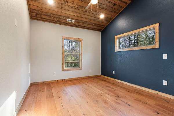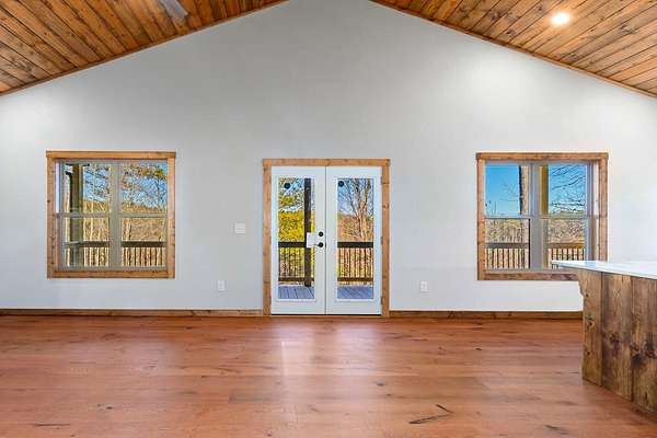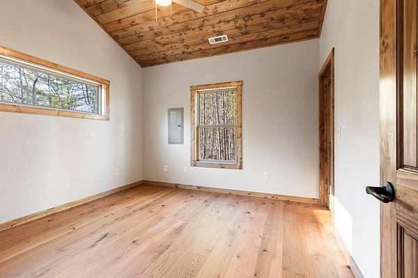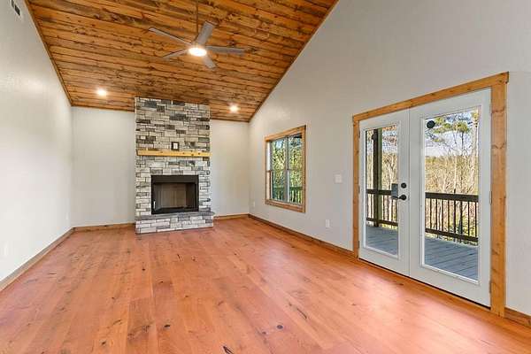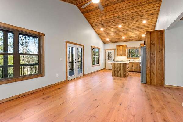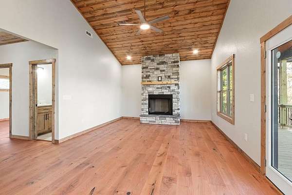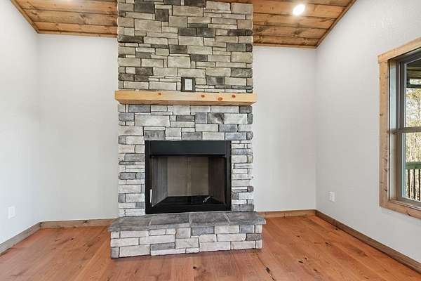A new home by one of Murphy's best home builders! This warm and rustic single-level 2-bedroom, 2-bathroom cabin is in the PRE-CONSTRUCTION stage on almost TWO wooded acres, just minutes from town. Designed for comfort and style, this home offers easy access to the full-length covered porch with tongue and groove ceiling. Inside, the spacious Great Room features wide plank oak floors that extend throughout the home, a vaulted tongue-and-groove ceiling, and a cozy stone gas log fireplace, creating a warm, inviting gathering space. French glass doors open to the porch, blending indoor and outdoor living. The kitchen includes granite countertops, a center island, and knotty pine cabinets. Both bedrooms are designed for comfort, with two full bathrooms showcasing quality tile finishes. The exterior has a durable black metal roof and LP wood siding for long-lasting appeal and low maintenance. All materials/finishings are subject to change. This builder's homes do not stay on the market long, so come make it yours and pick out your own finishes today!